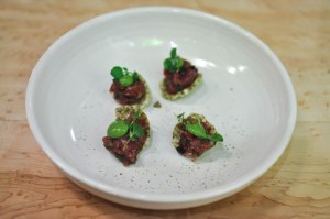 4th: Beef Tartare, Mussel Emulsion, Watercress, Ramp Capers. On crackers made of tapioca and pickled ramp water. This bowl smelled like the ocean. And left a feeling and flavor in my mouth like I just ate seafood. Lovely beef flavor is prominent on the palate and set off by brilliant ramp capers. Very creative. I’ll surely order this if I see it on the menu next time. Rocky wants a bag of the tapioca chips.