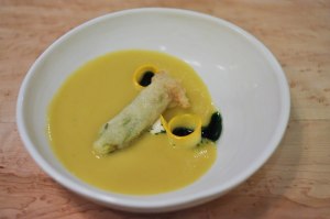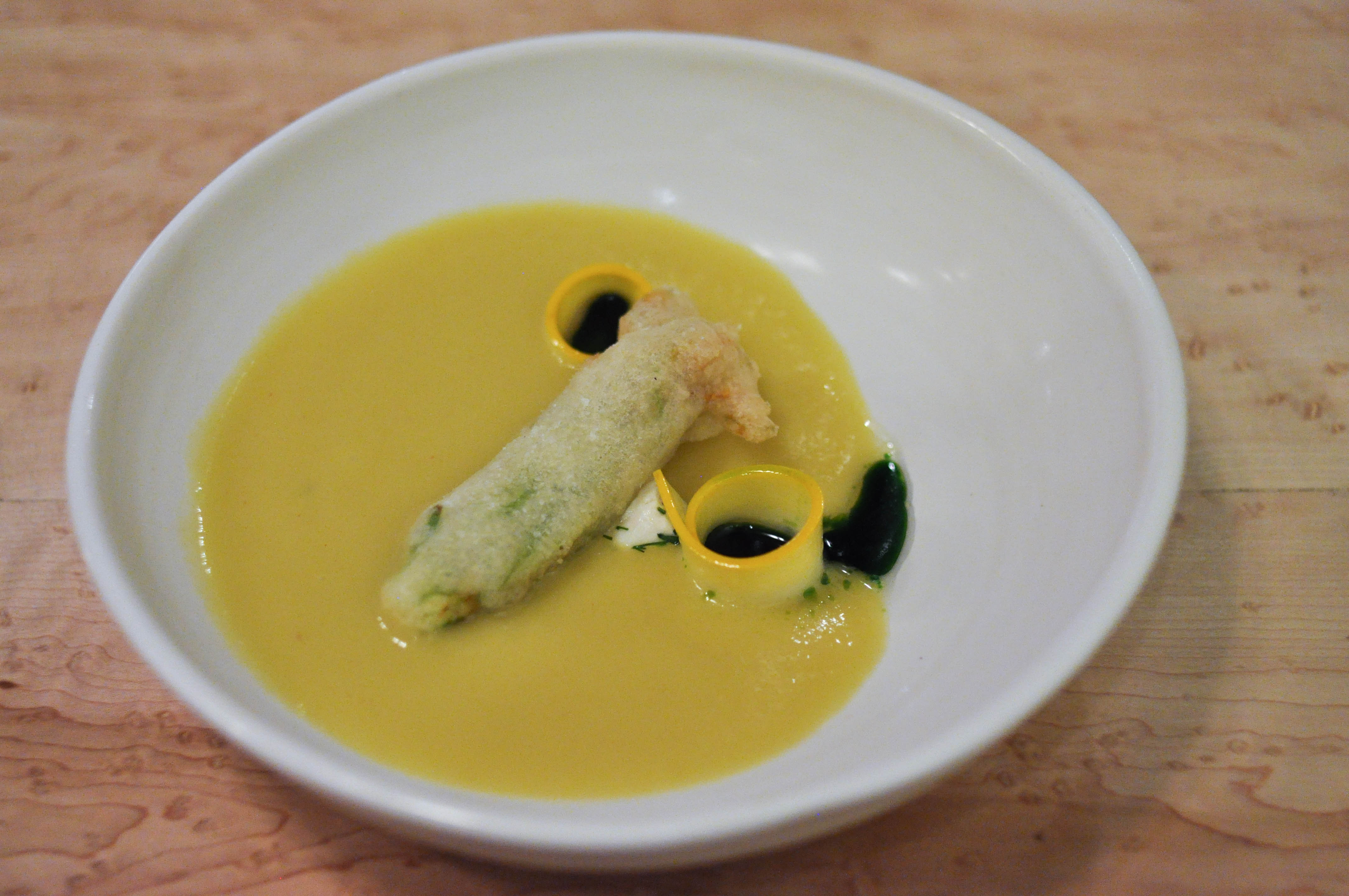 5th: Gold Bar Squash Gazpacho, Zucchini Blossom, Fresh Chèvre. Yummy. Not at all overly-sweet(unlike most squash based soups I’m fearful of being served). A tempura-like blossom is always a plus.