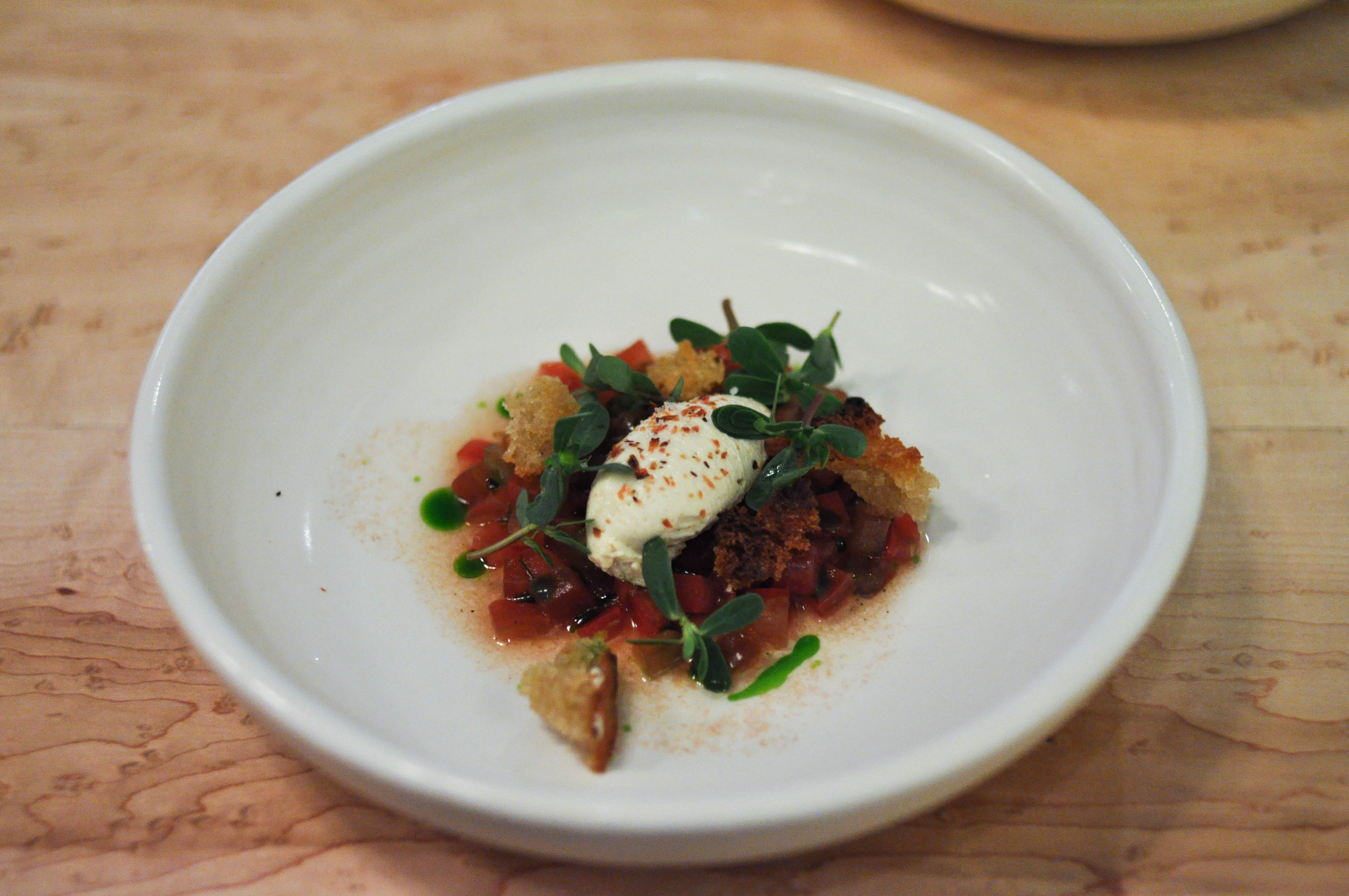 5th: Tomato ‘Tartare’. Smoked Tomato Water. Mint Oil. Poached Mackerel Cream. Toasted Bread. This didn’t pack as strong of a seasonal tomato deliciousness as I had hoped for, but the combination of the tomato with the smoke and mint certainly put me into deep-thought-mode for a moment.