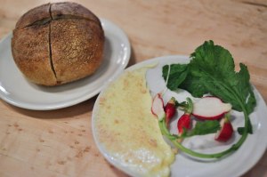 Bread, Butter and Radishes. Warm sourdough baked in-house. Light, but firm crisp to the crust. Fluffy crumb. Spicy fresh radish. Butter, topped with salted rind of Timberdoodle cheese.