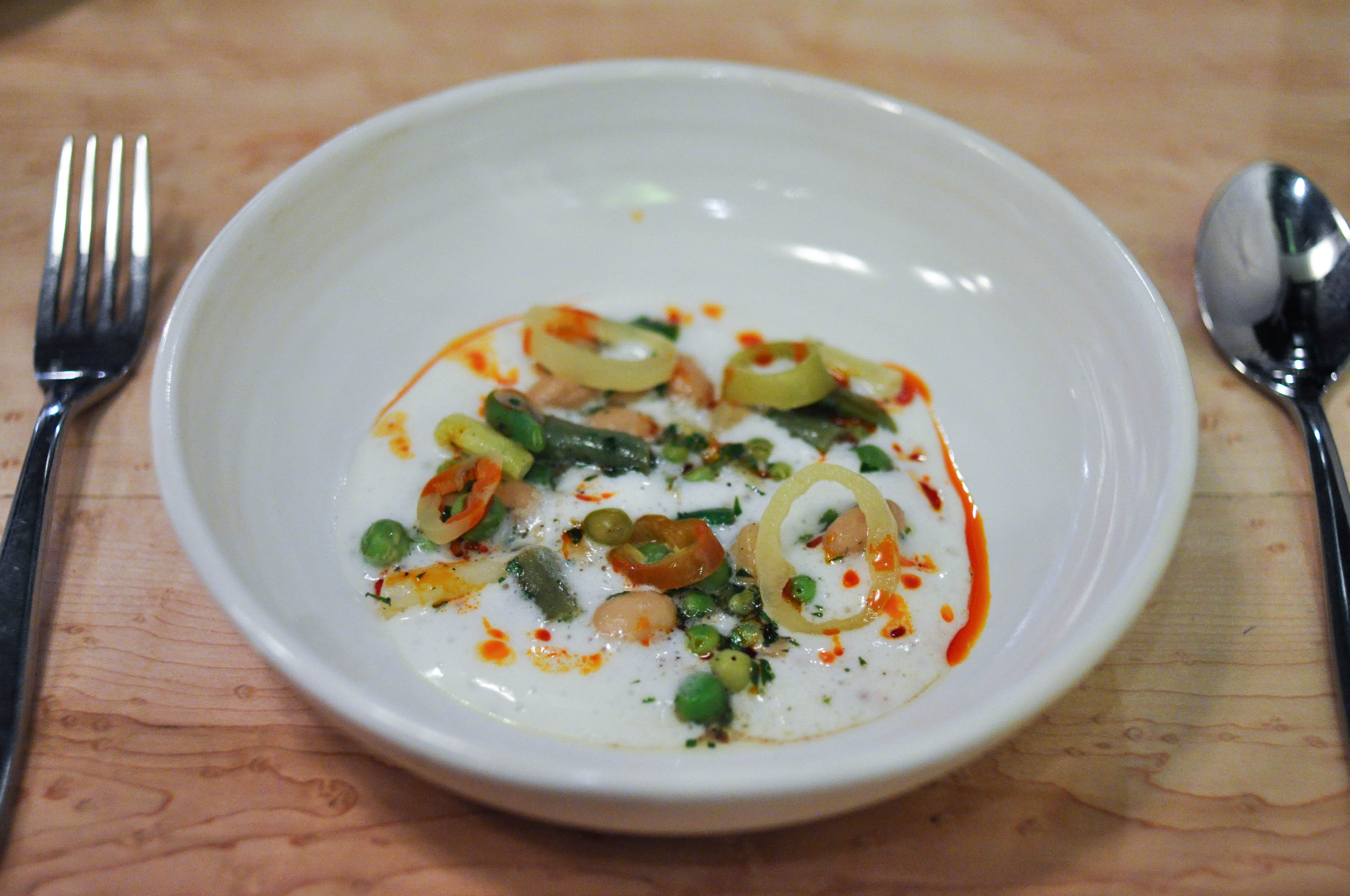 6th: Summer Beans, Whipped Salt Cod, Chorizo Oil. A selection of beans, all cooked appropriately, peas, pickled peppers. The whipped cod was pleasantly subtle, and very light. The peas were great in the chorizo oil. Strong flavors restrained just enough to accentuate a beautiful plate of legumes. This was my second favorite dish of the night.