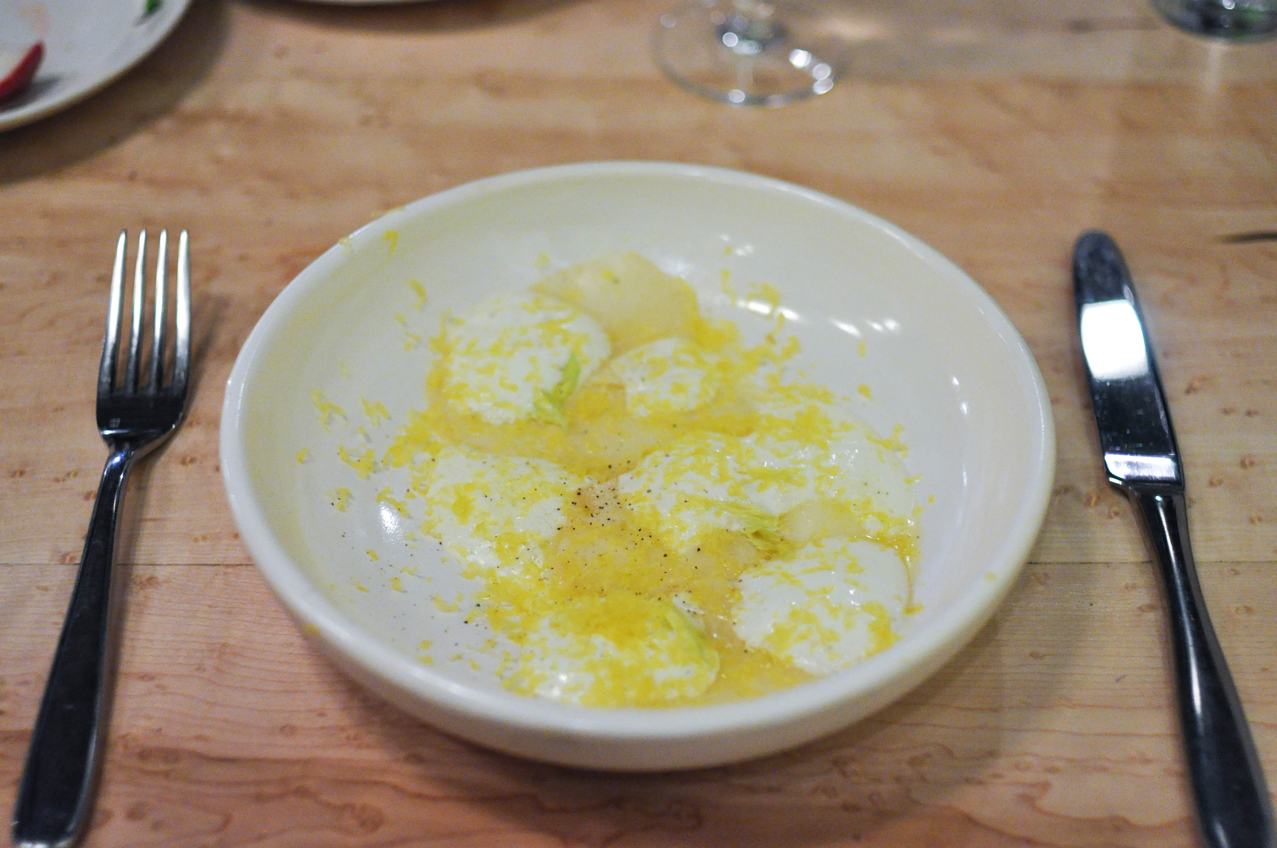 8th: Glazed Celery Root. Embryonic Egg Yolk. Cabot Clothbound Cheddar Mousse. Lemon Zest. I adore celery root; this example maintained the right amount of crunch without being tough. The embryonic yolks were cured and grated over the slices of root and spots of mousse. Deep richness was brightened by the lemon zest. I’m very happy to have had this and can still recall the dynamic flavors.