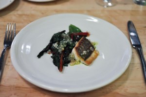 9th: Porgy Fillet, Swiss Chard, Fish Sauce, Tapioca, Chile Pepper, Cilantro Oil. My piece of fish was cooked perfectly; great flavor and texture. The crisped skin was lovely. The chard, described as ‘wilted’, had a wonderful strength still in the leaves as well as a nice spice. I’d have been pleased with just the fish and the leaves. I didn’t like the tapioca. I’d have preferred a more firm or crisp grain or potato to the gummy starch.