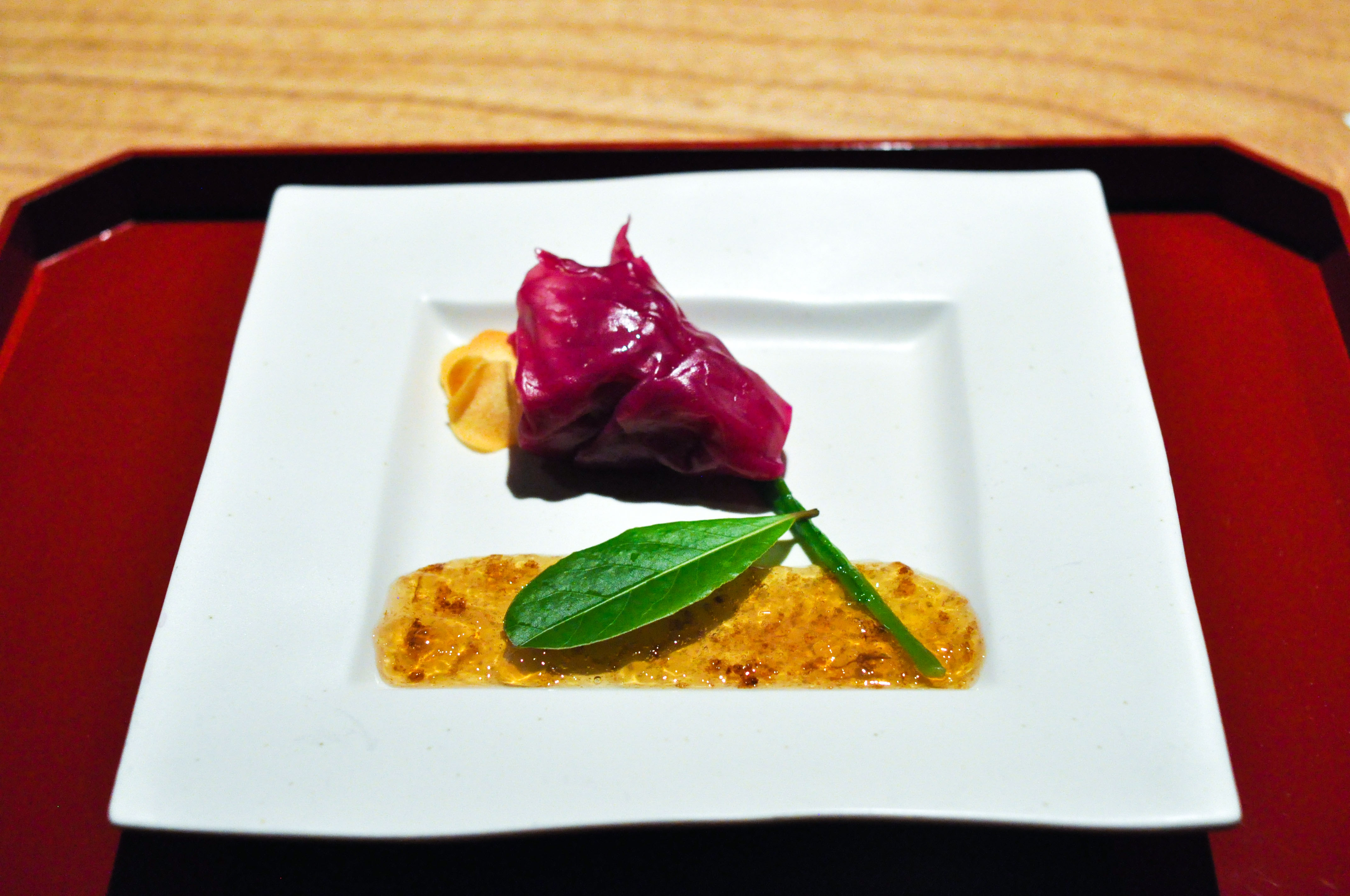 Camellia Flower Plate. Red cabbage, turnip, arrowhead root, watercress, vinegared jelly, malva nut. Presented as a scene of a flower growing from the ground with ‘pollen’ of arrowhead root chips. The ‘petals’ were thick, tasty cuts of cabbage. The jelly had a yummy savory/acid balance. While it wasn’t at all bad, this was a super underwhelming opener.