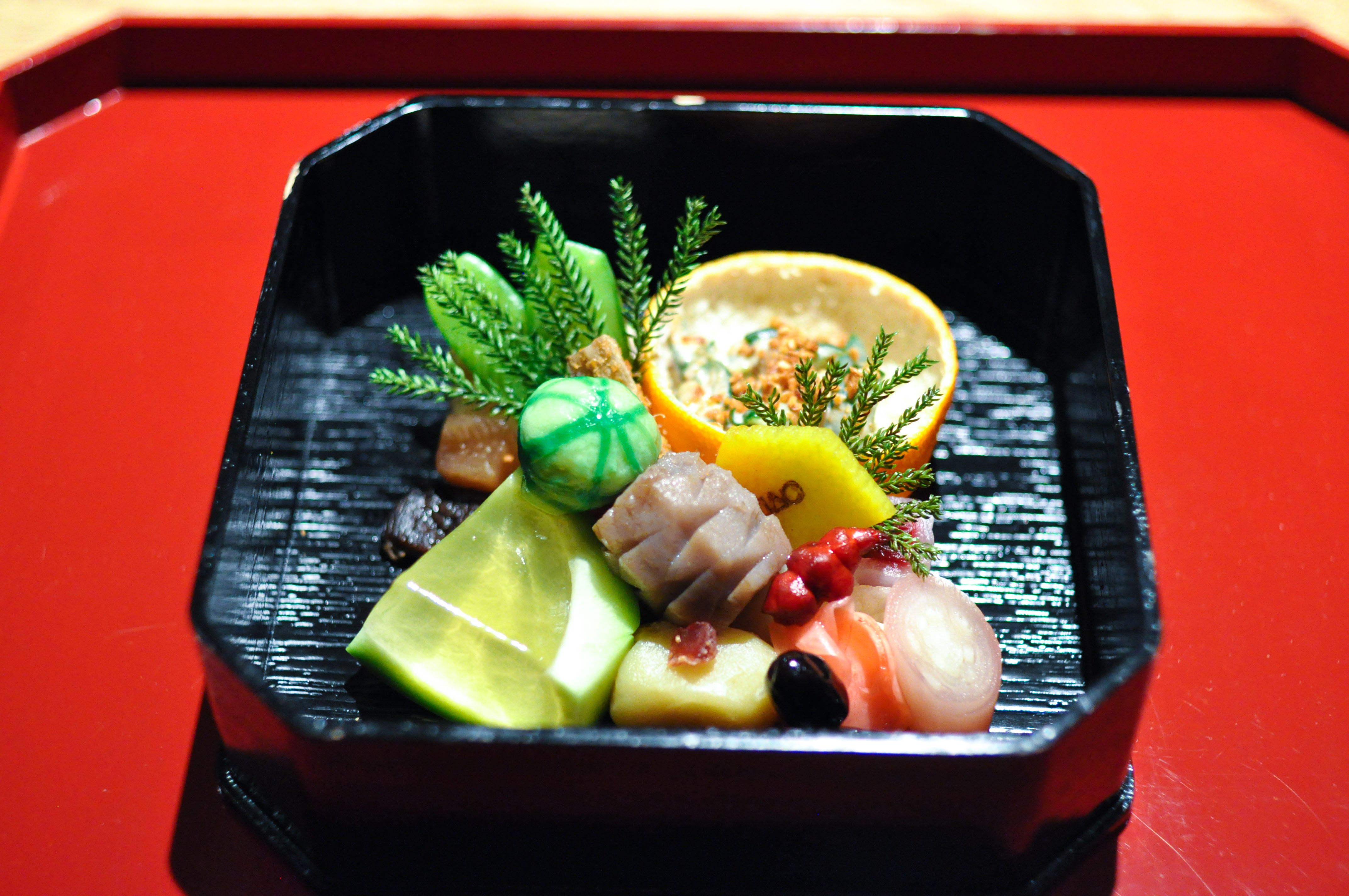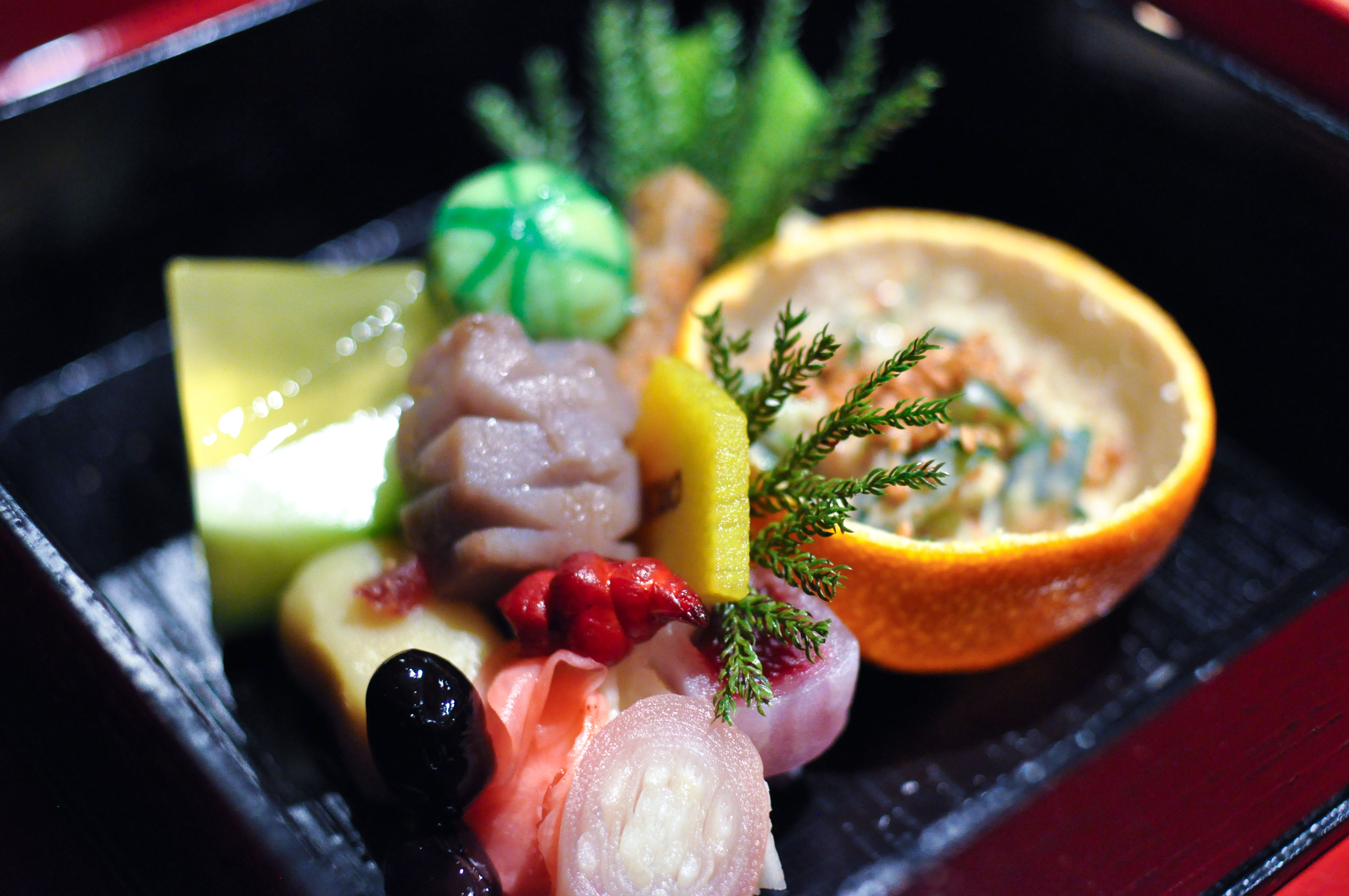 New Year Osechi Box. Yuba, snow pea, burdock root, shiitake mushroom, golden beet, temari-fu, potato, chayote, sweet potato, cucumber, date, yam, beet, daikon, radish, parsnip, myoga, crosnes. Quite the assortment of items and preparations. A delightful compilation of tastes and textures. I particularly enjoyed the black soy beans, the sliced golden beet, and the thin shaved turnip wrapped around a cube of red beet.