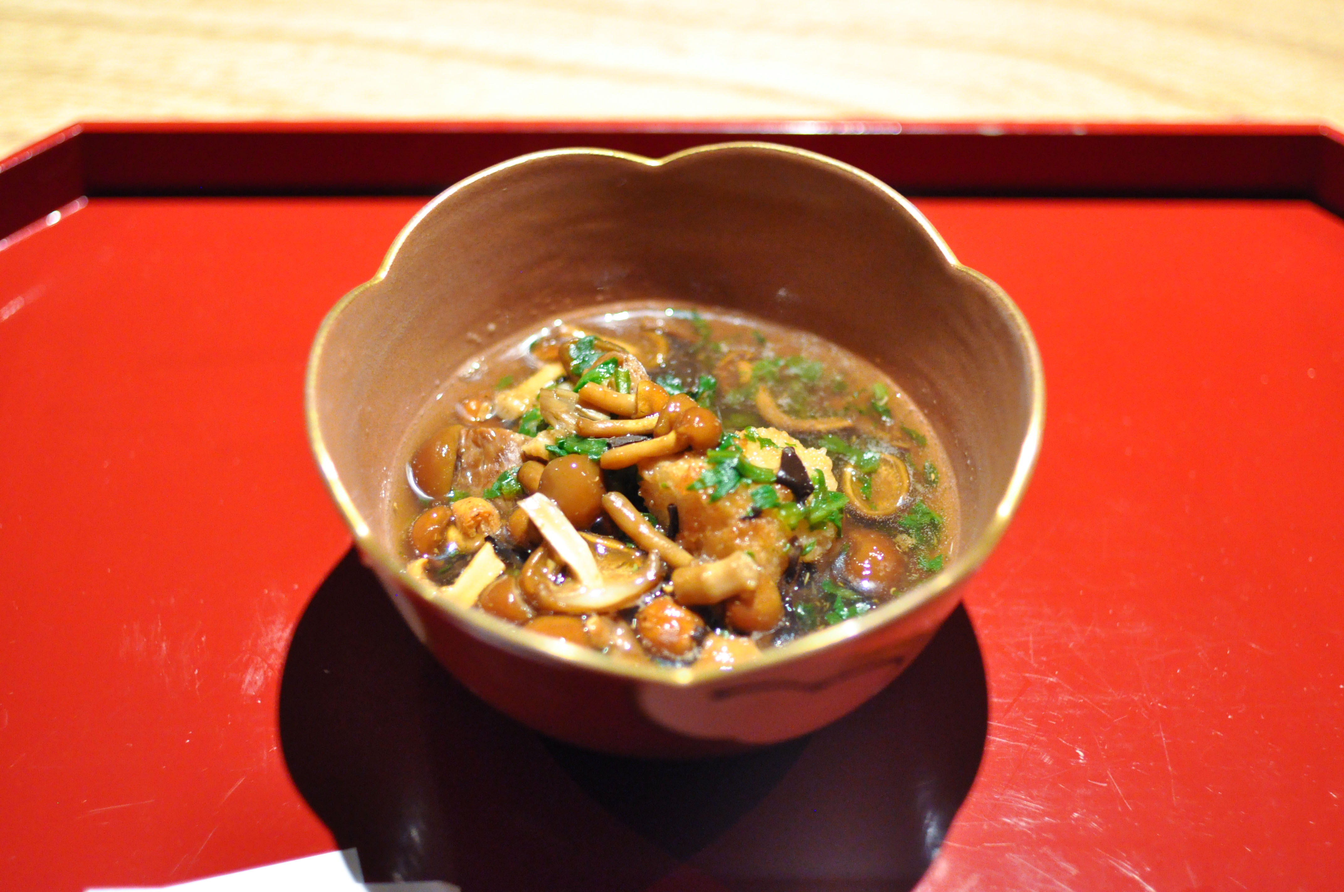 Fried Taro with Shungiku Sauce. Rikyu-fu, variety of seasonal mushrooms, ginger. Another winner. The fried taro was incredible. The varieties of mushrooms had great textures and earthiness that added extra depth to the Shungiku broth.