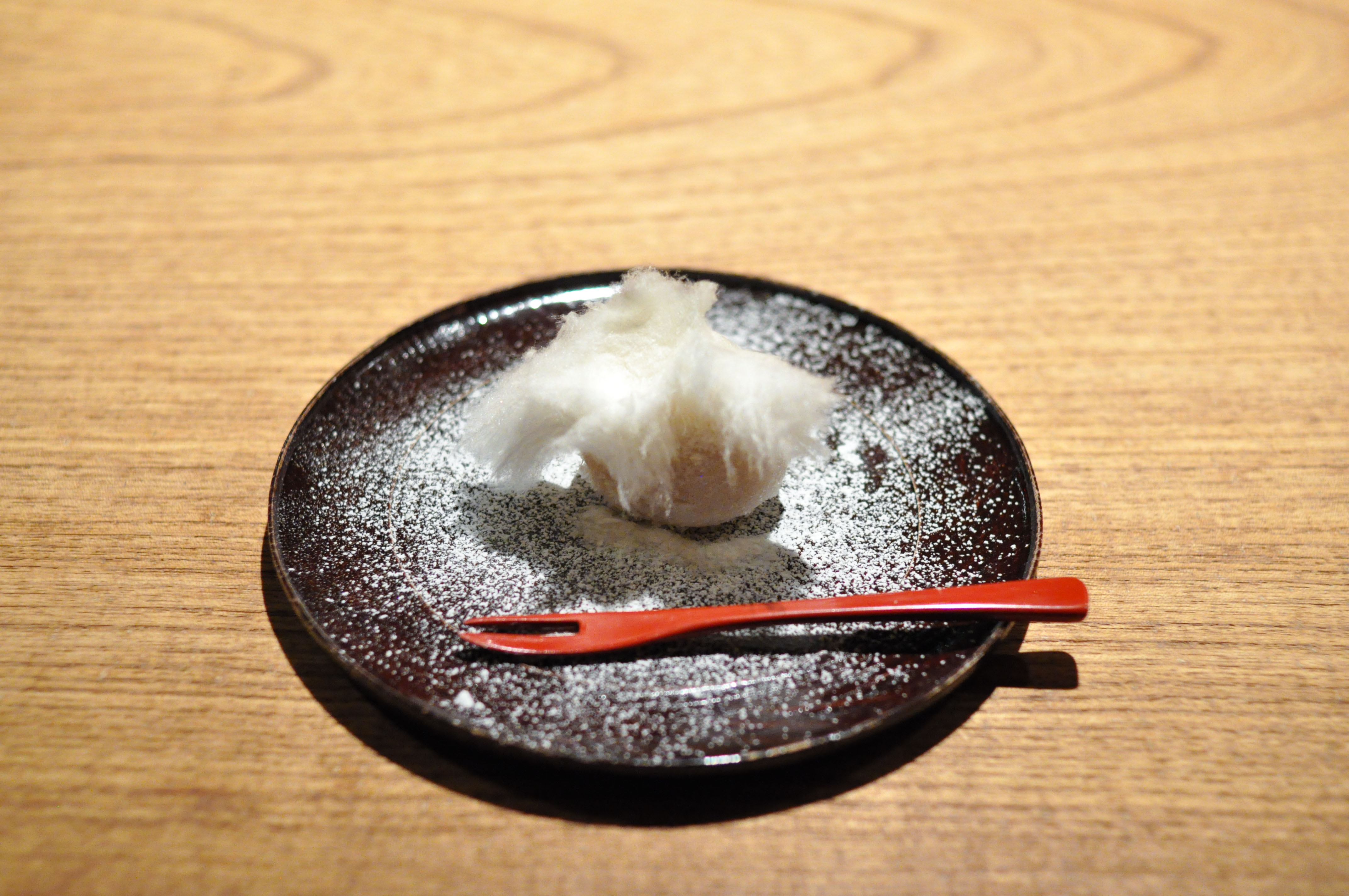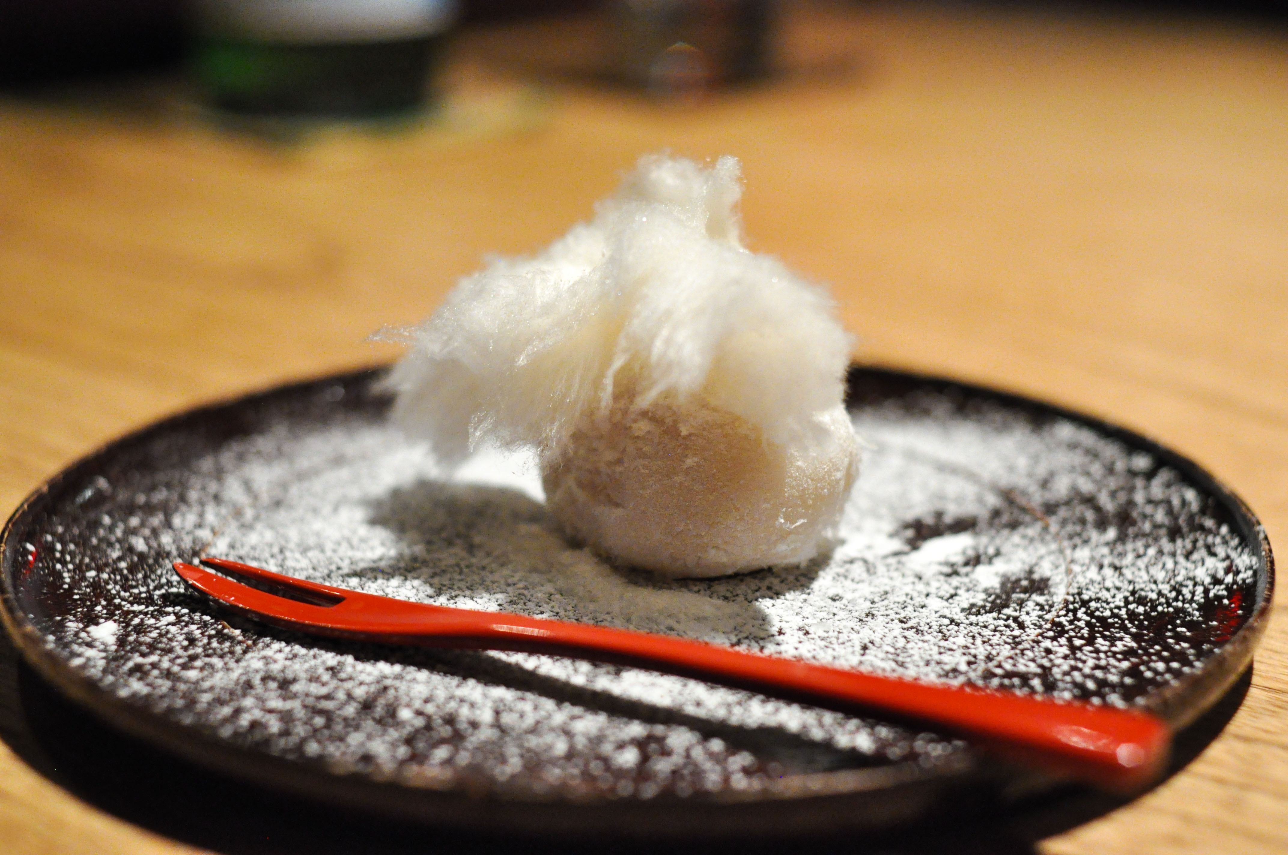 Snow Mochi Cake. A mochi rice ball filled with sweet white bean paste and topped with what seemed like spun sugar.