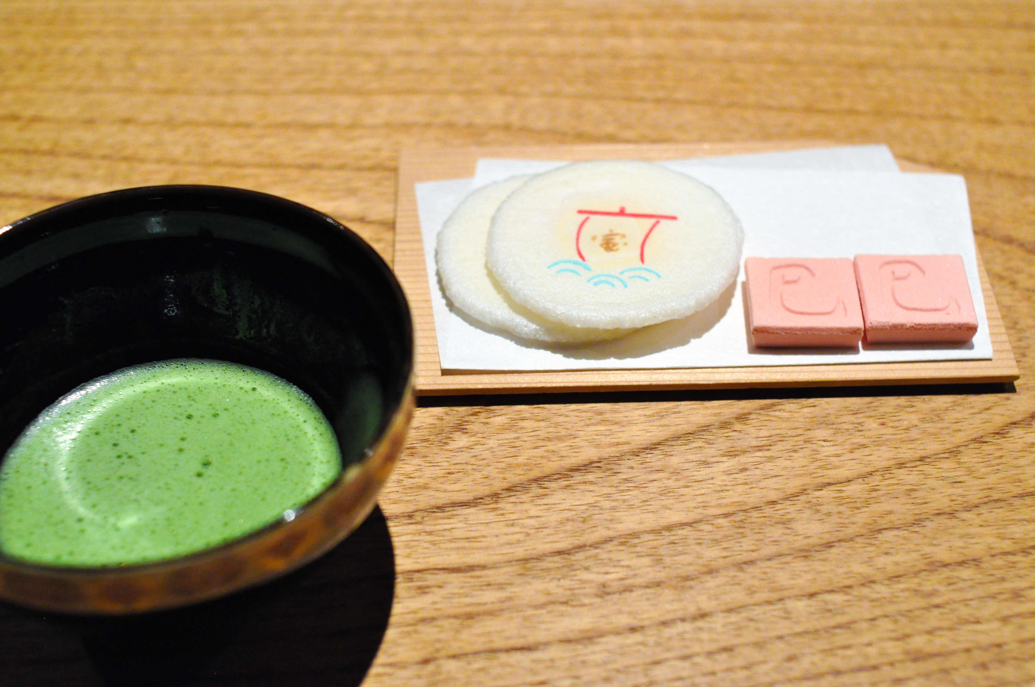 Matcha with Candies by Kyoto Suetomi. A sugar candy representing the year of the snake and a light rice and sesame cookie. Along with a small serving of warm matcha.