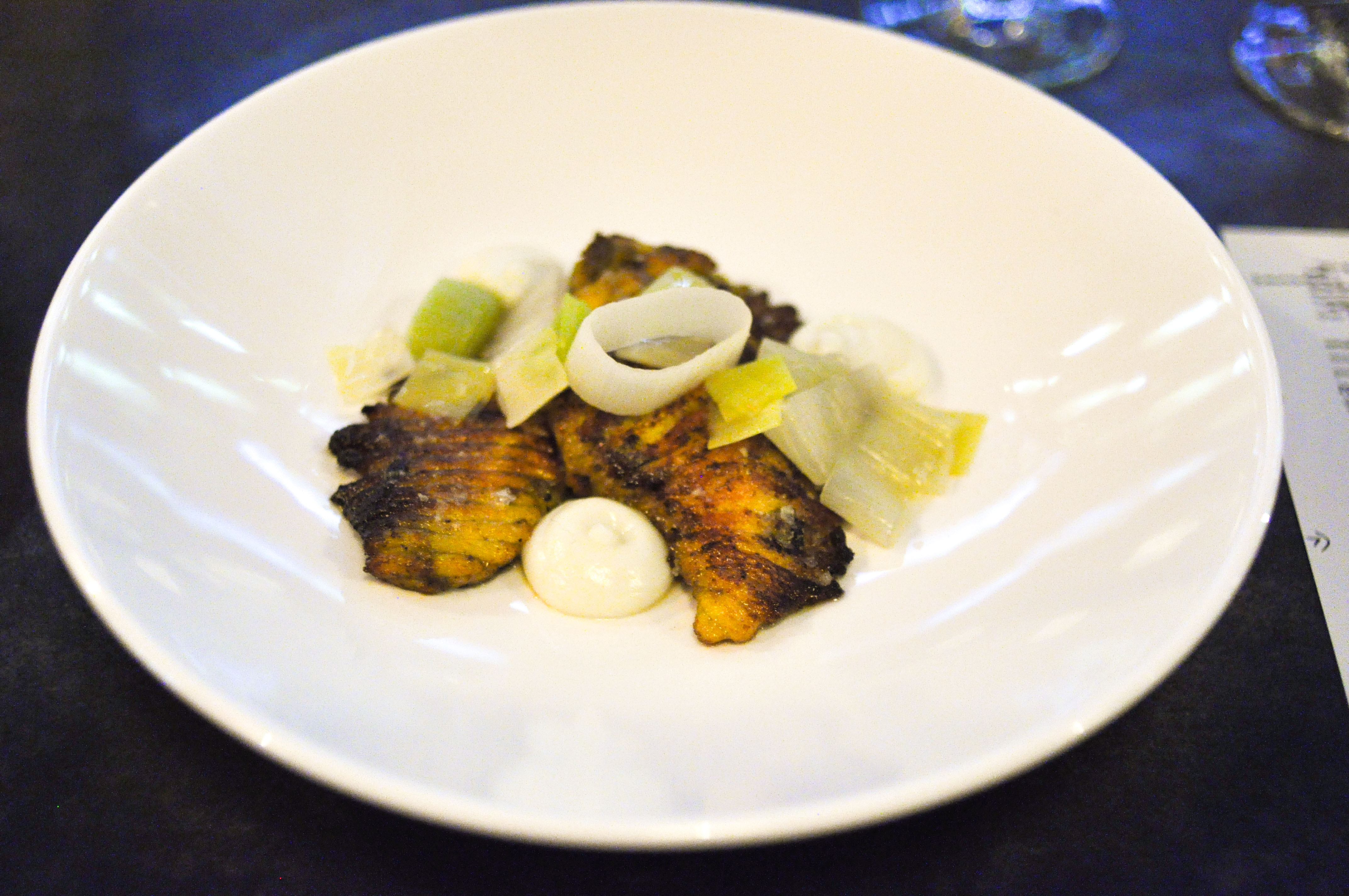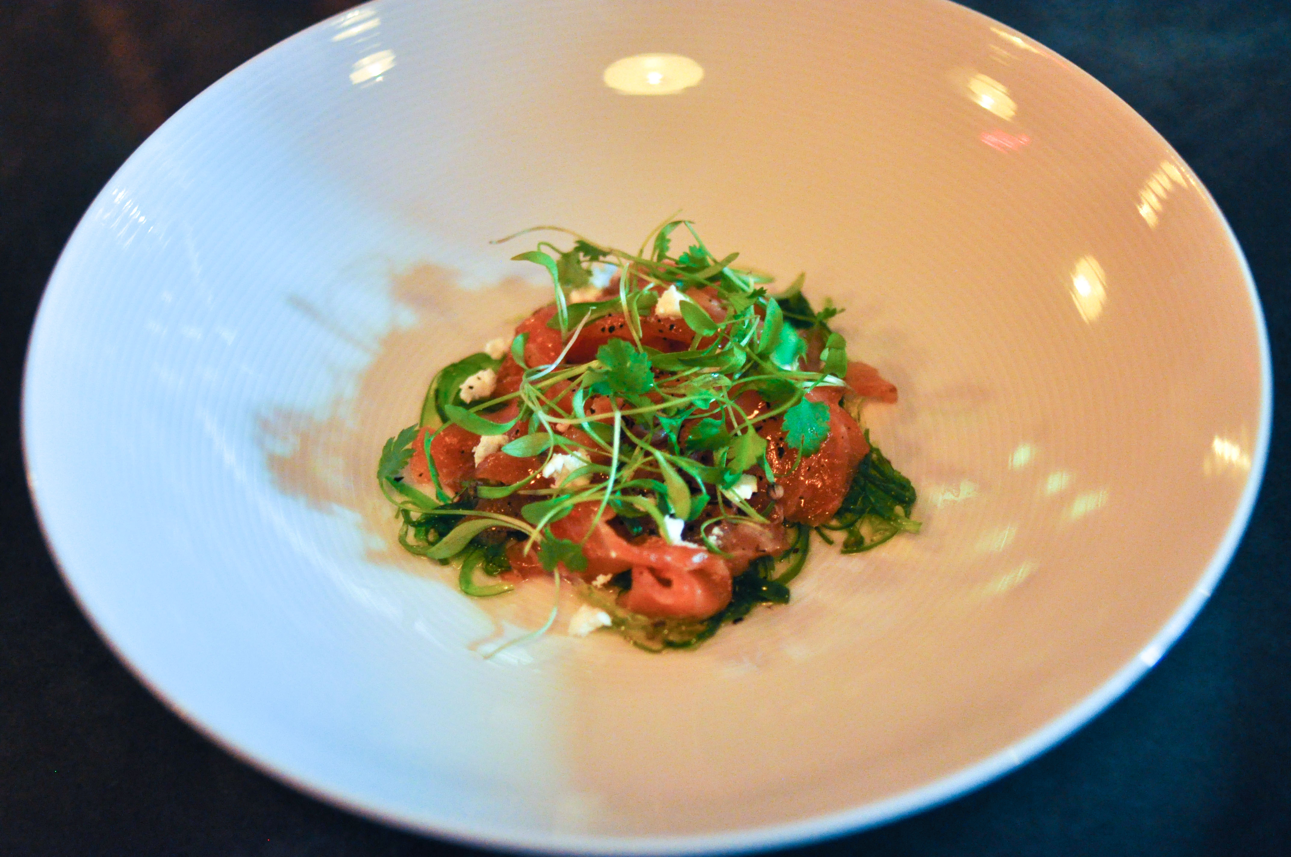 Tea cured salmon, goat cheese, tamarind, seaweed. Nice strips of salmon with a little tang and pleasant light bitterness from the tea cure. The seaweed beneath was simply wonderful, well dressed, with a great snap. A small amount of goat cheese for a little fun.