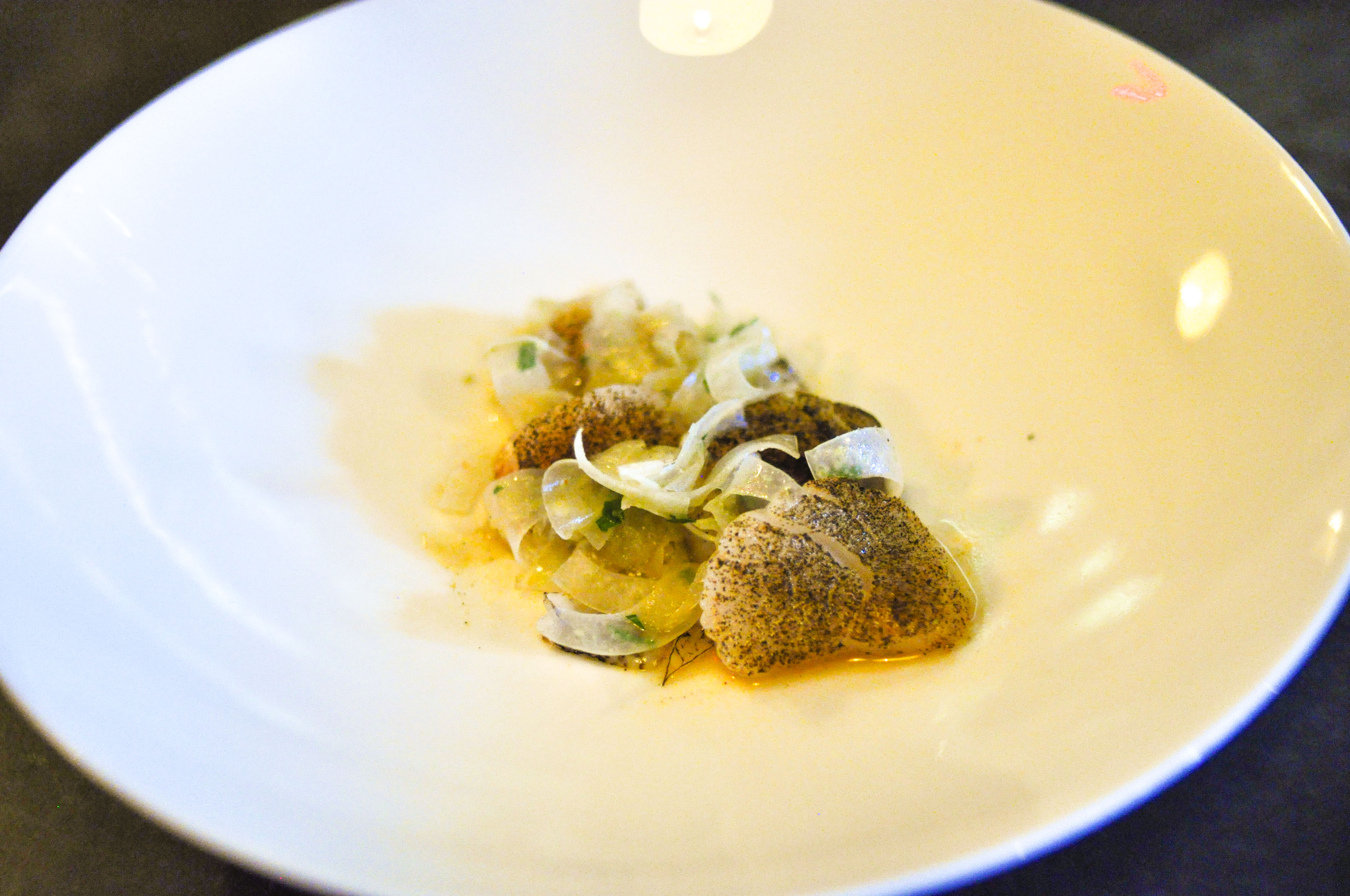 Diver scallop, fennel, lily bulb, berbere. The toasted(torched) berbere spice was really neat against the sweetness of the scallop. The pickled lily bulbs added nice florality(not yet a real word).