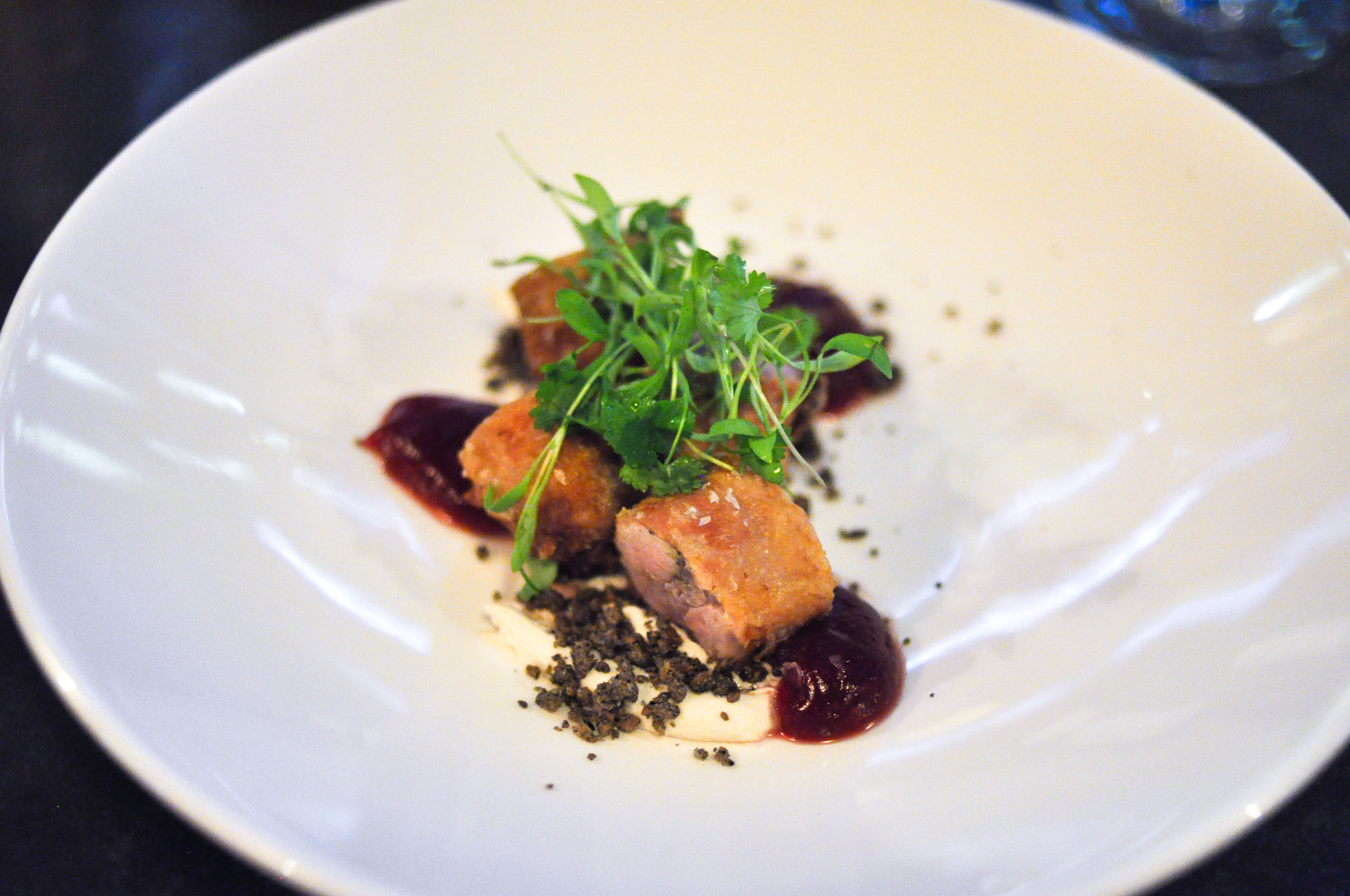 Duck confit, red cabbage, celery. Confit duck in panko breadcrumb and slice of confit leg draped atop. Kickin acidity from pickled red cabbage puree and tart earthy astringency from celery ribbons and leaves made a cool dynamic with the rich duck.
