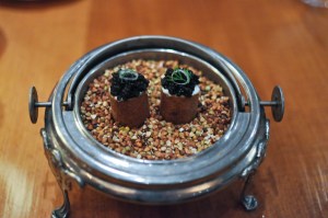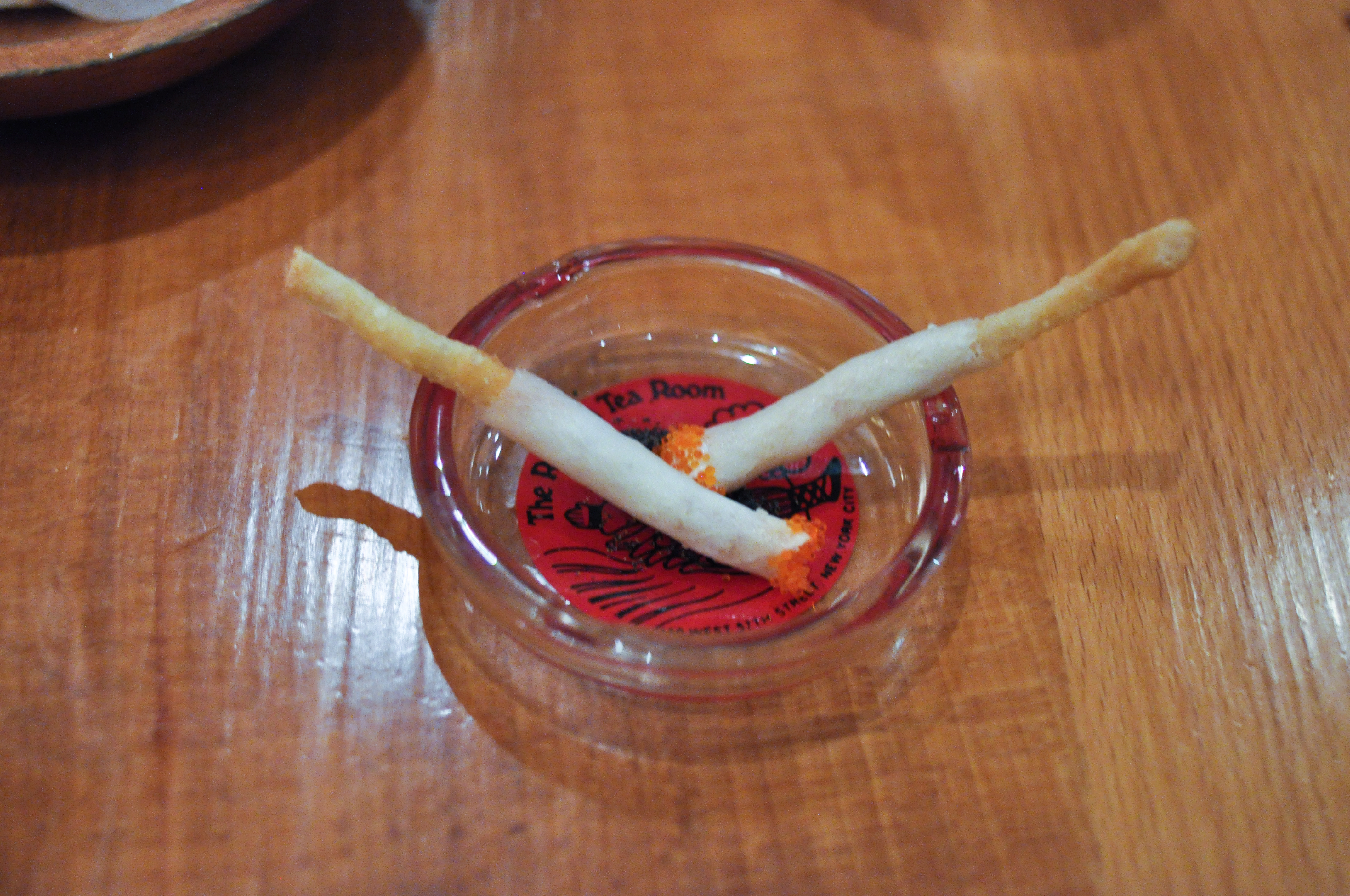 SABLE CIGARETTES. Stork Club. Gnocco fritto, wrapped in smoked sable, dipped in cod roe, with poppy seed ash. Despite the gimmicky nature of this snack, I thought it was delicious.