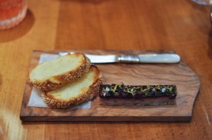 RABBIT TERRINE. Toasted Italian Bread. Another winner. Rich rabbit game, nicely seasoned, countered by sour cherry jam, lemon zest, and rosemary.