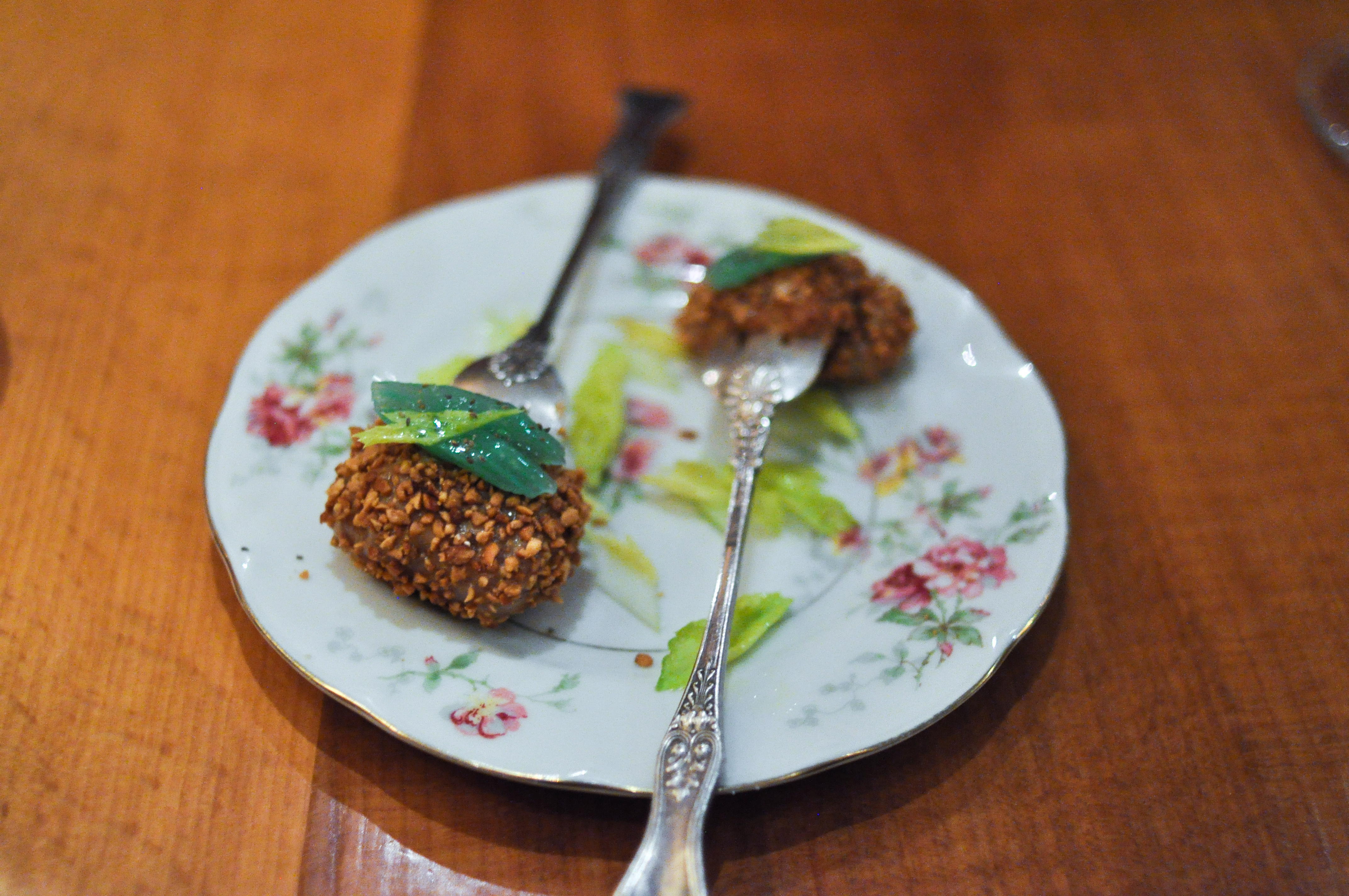 CASHEW CHICKEN. A Southern Mulberry Classic. Fried chicken oysters rolled in chopped cashews, served on century-old Tiffany & Co. spoons. Outstanding.