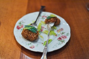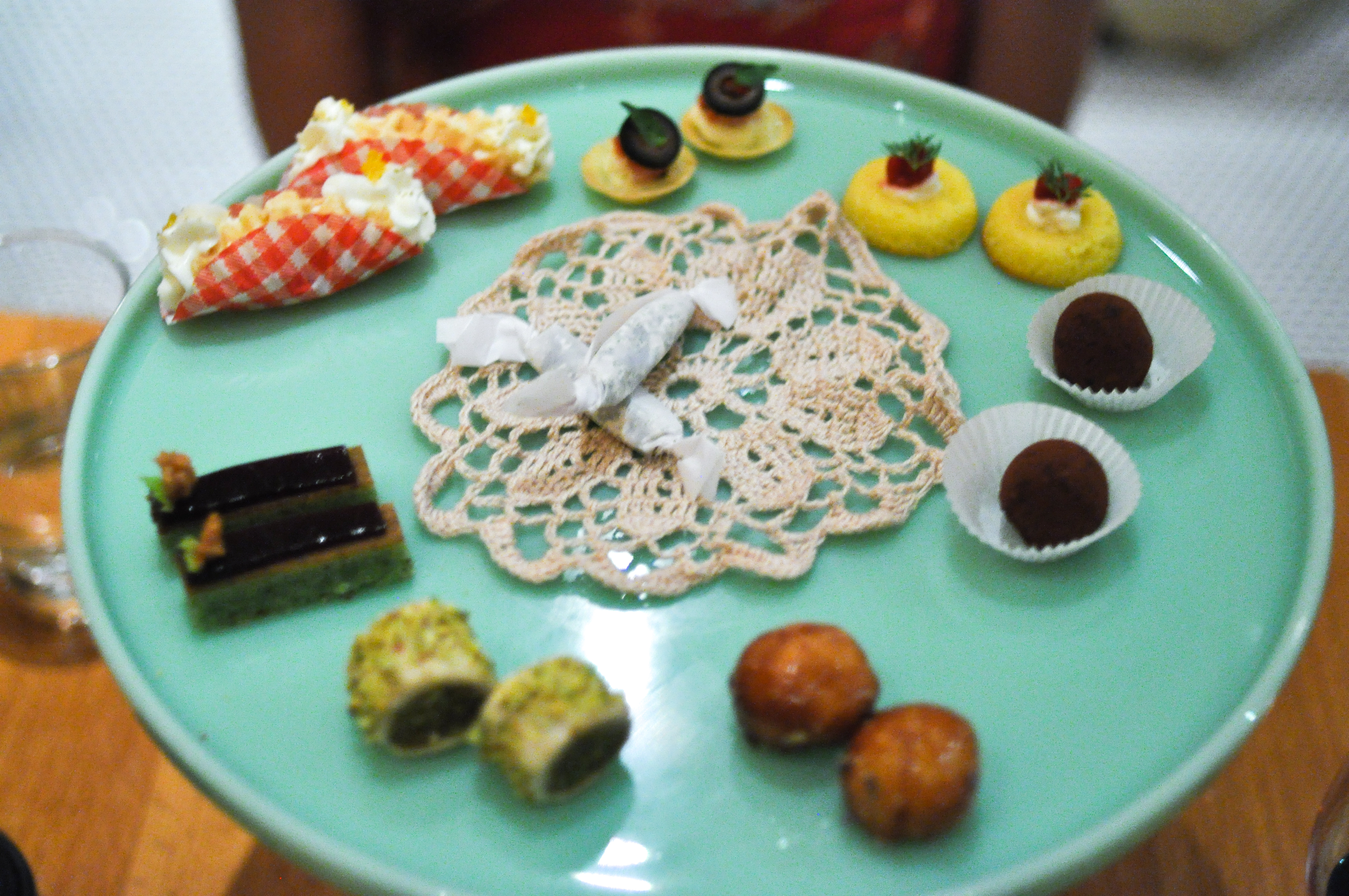 PASTRIES. Ferrara Bakery. Let’s see if I can name all these…Ricotta cannoli with orange zest. Polenta cake with ricotta and rhubarb. Peppermint truffles. A honey something that just kind of poofed away. Seaweed Taffy, dry and bitter. An interesting and kind of unpleasant olive wafer. A pistachio thing. Celery cake with concord jelly, which was much better than expected.