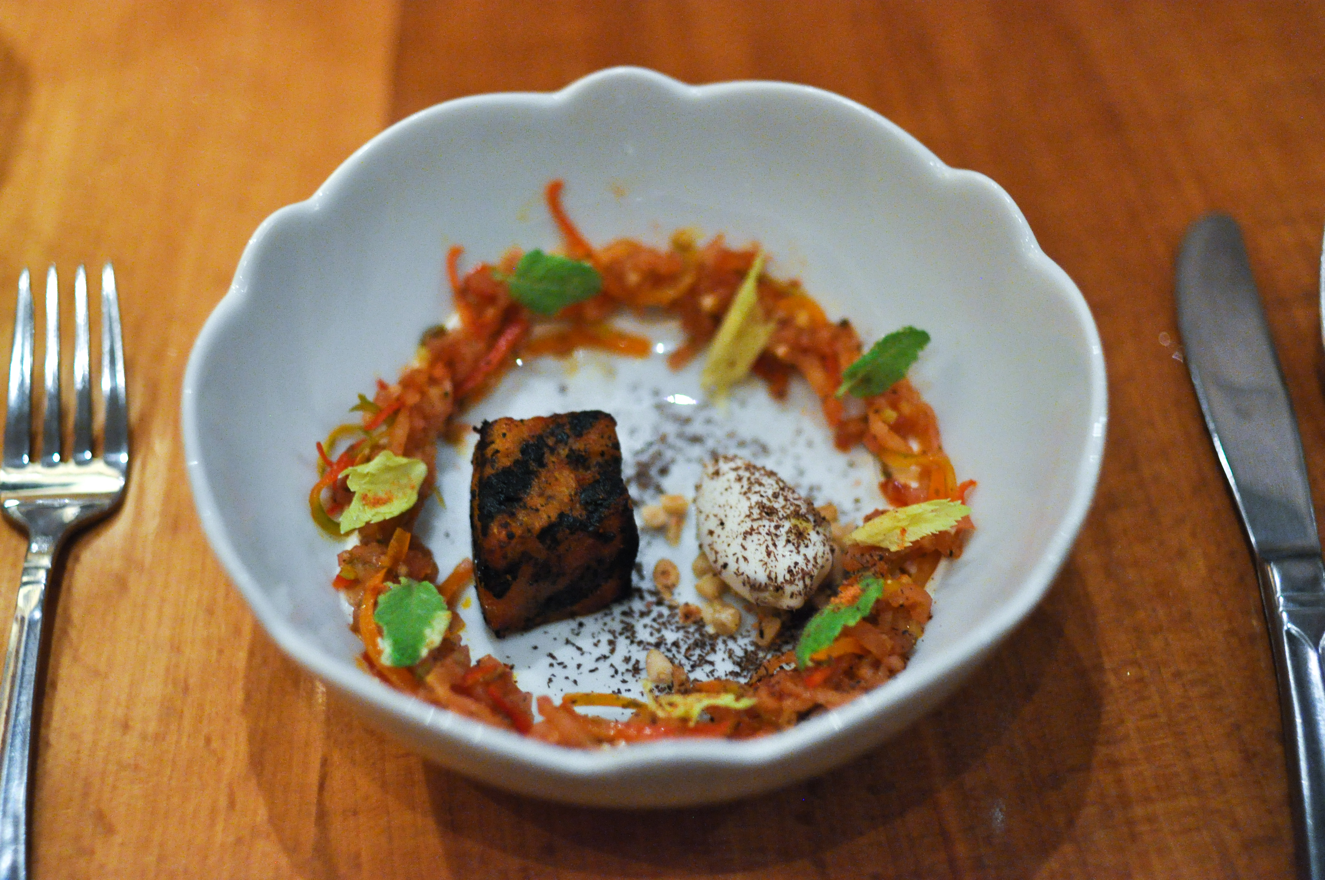 RAW CAPONATA. Bensonhurst BBQ. The feature of the dish, the BBQ eggplant, fell pretty flat. Though the caponata was nice, with good vegetable crunch and a little spice. The raisin creme fraiche ice cream gave a pleasant cooling effect.