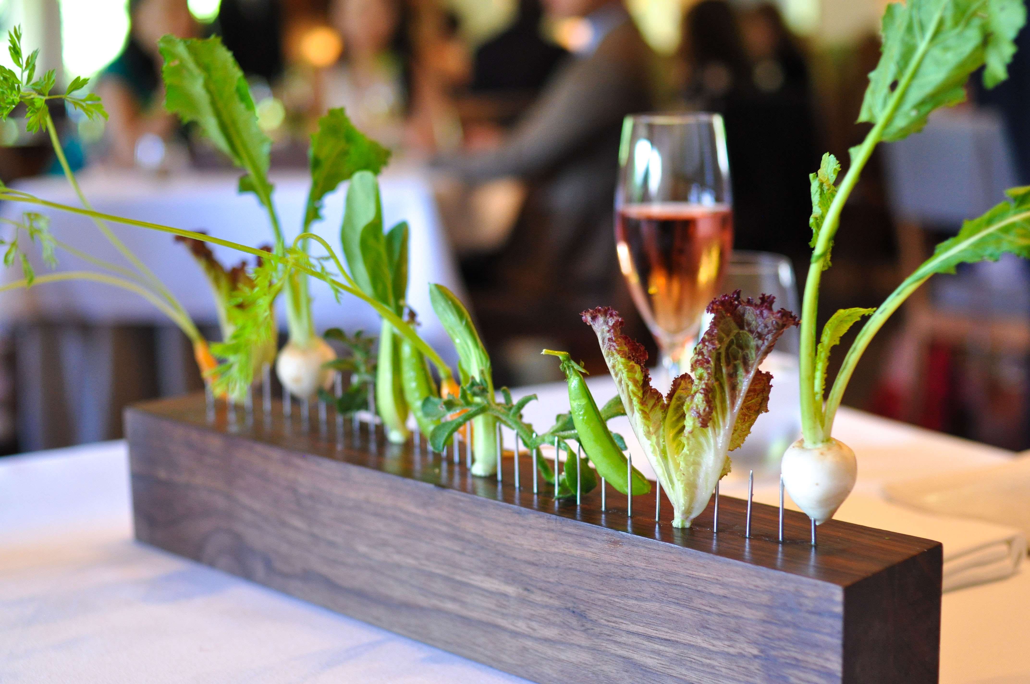Weeds from the garden with lemon verbena vinegar. Pea and popcorn shoots, to be snipped and dipped in tarragon pesto.