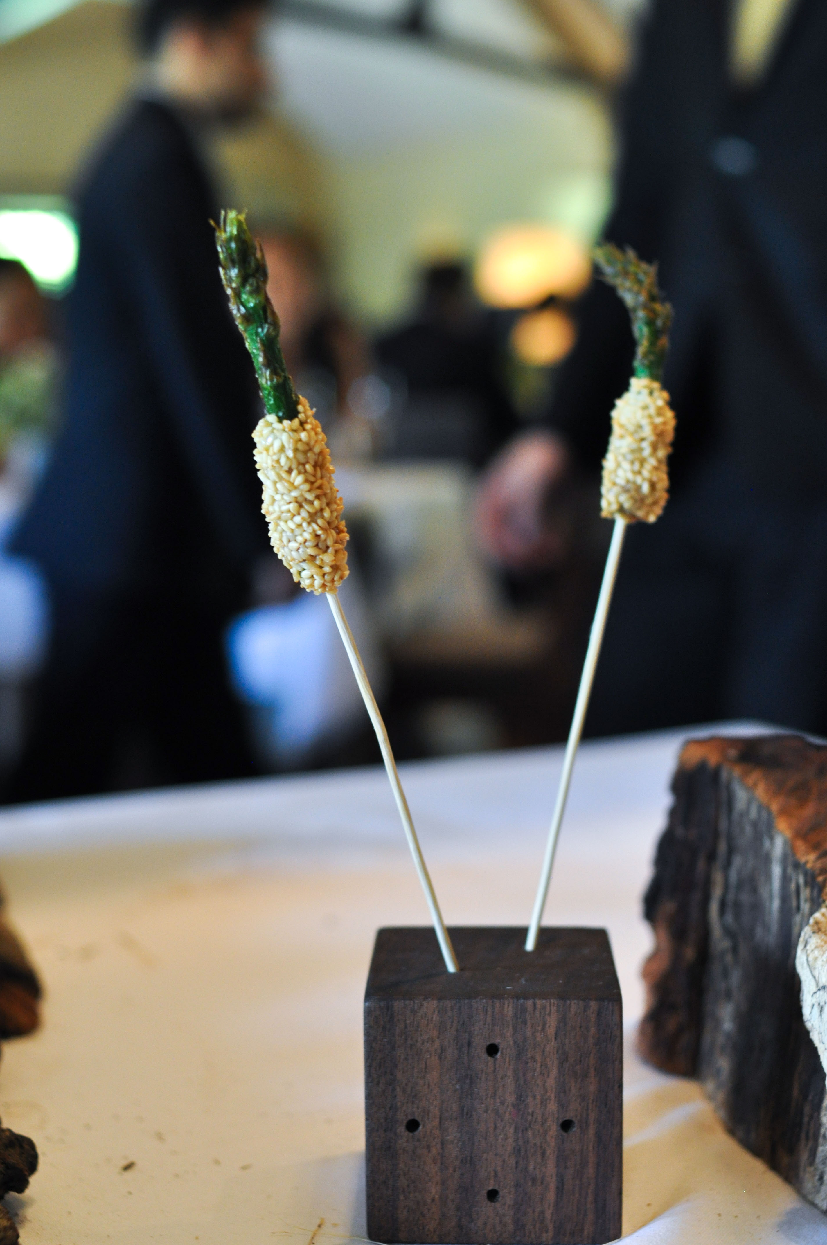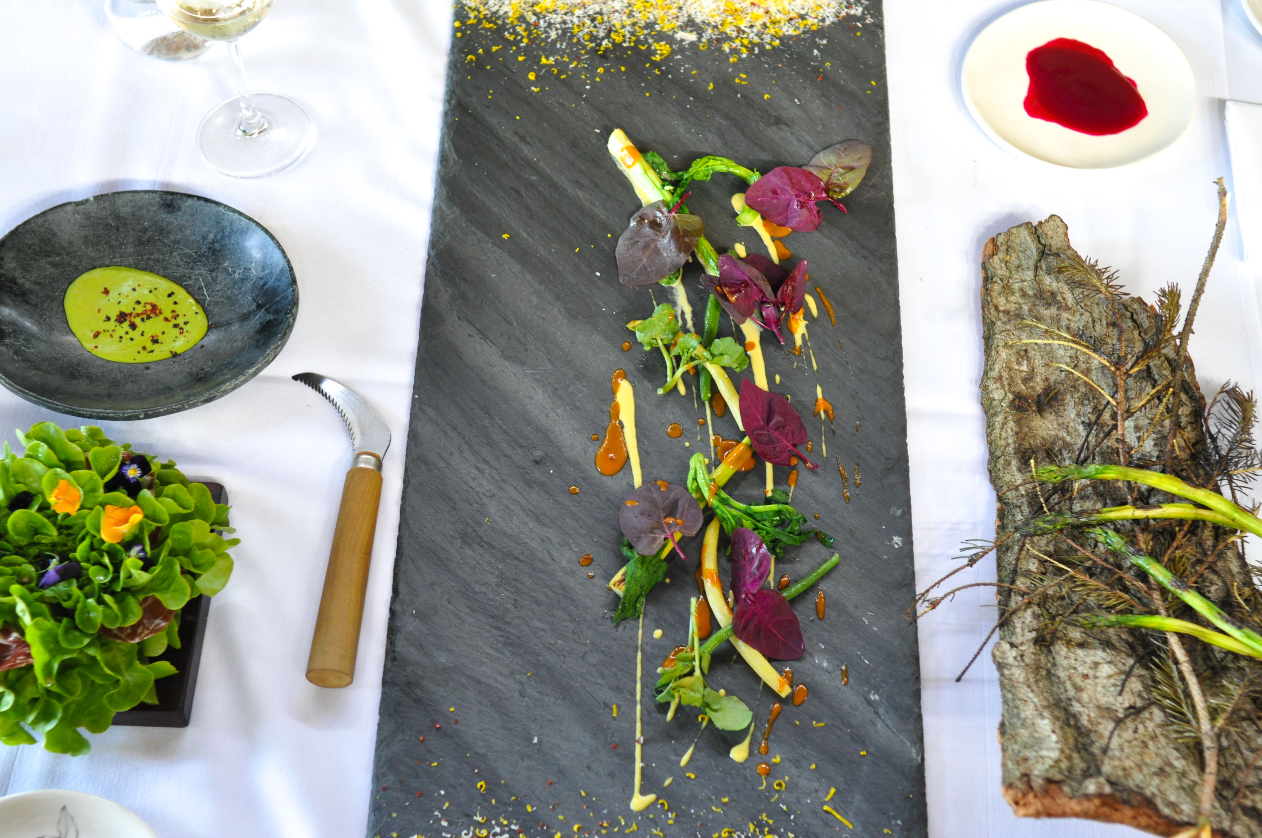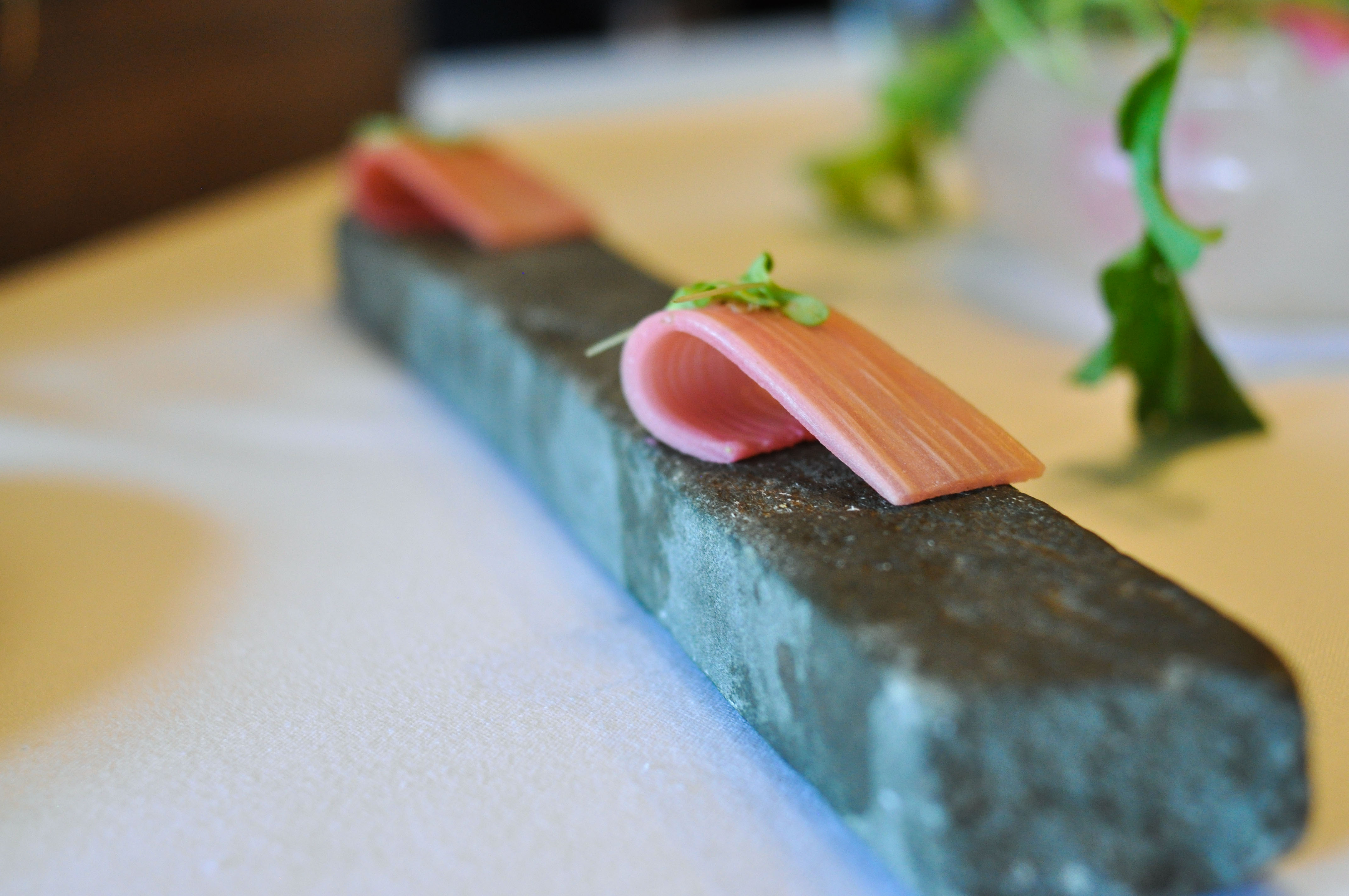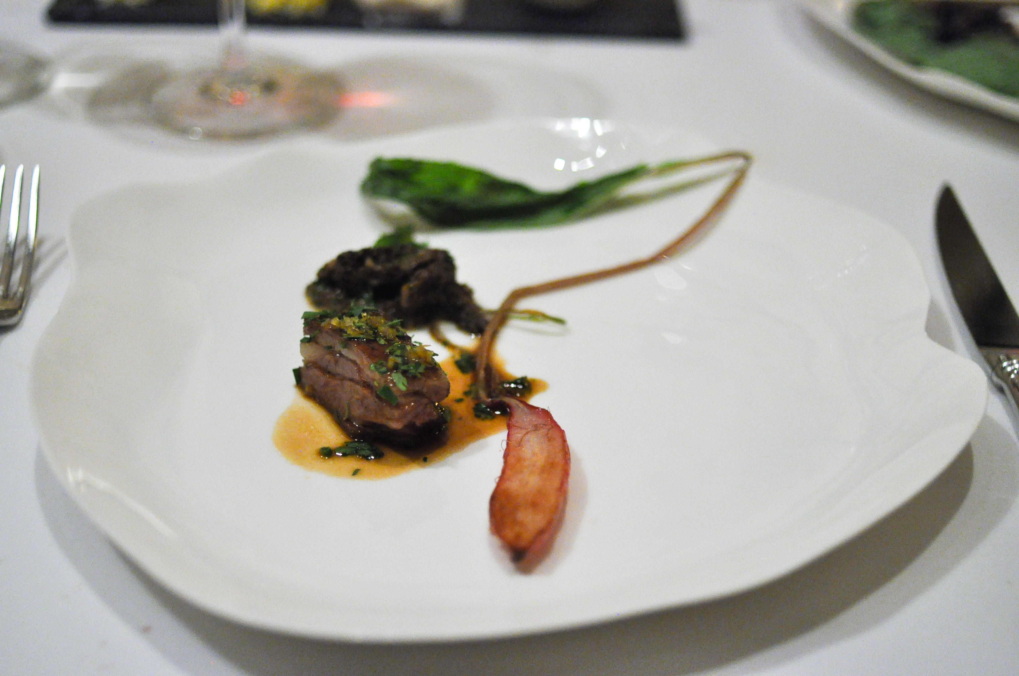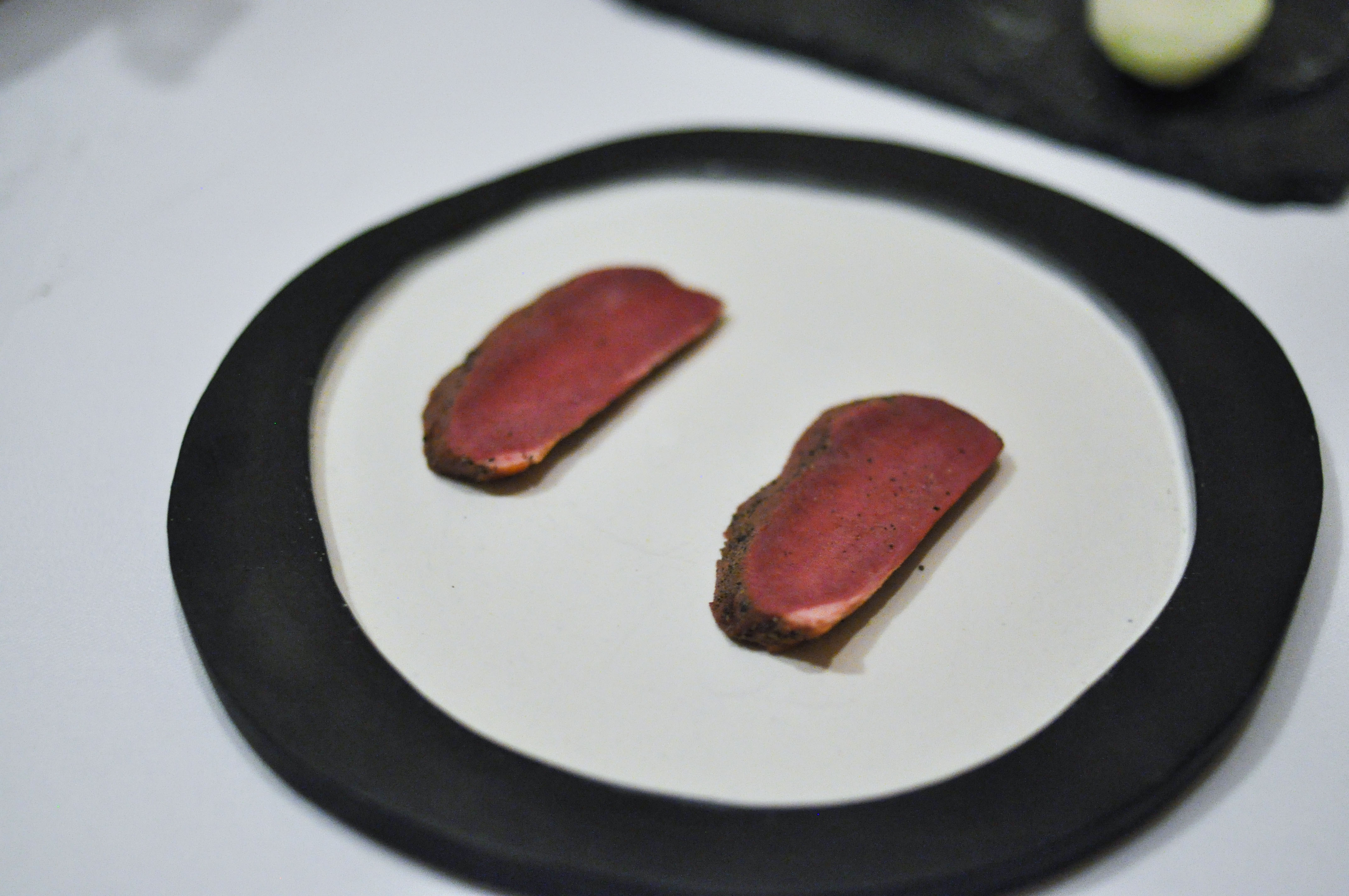 Pig heart pastrami, last year’s asparagus, cured egg yolk. The acidic asparagus with the rich yolk complemented the salty heart nicely.