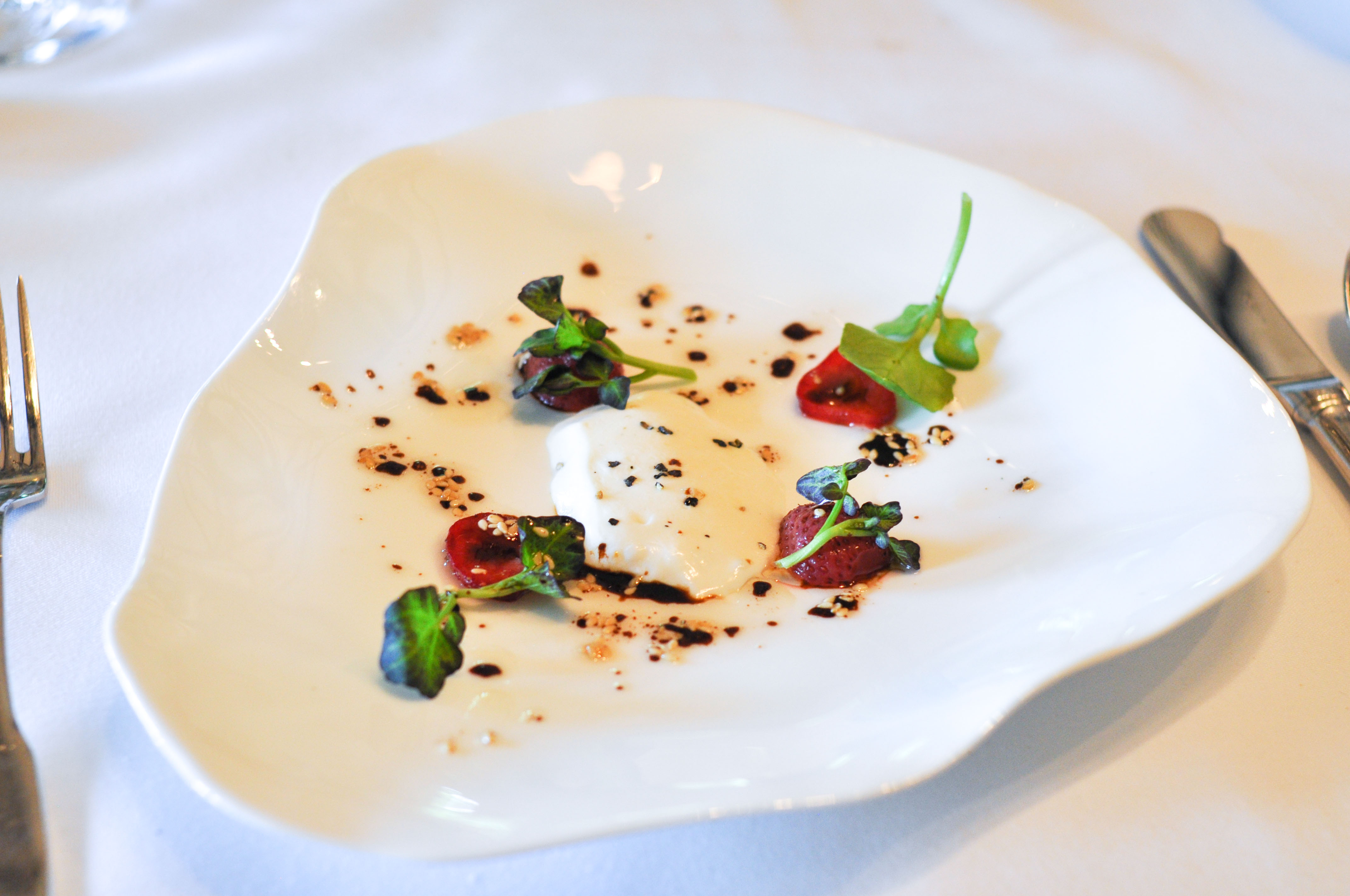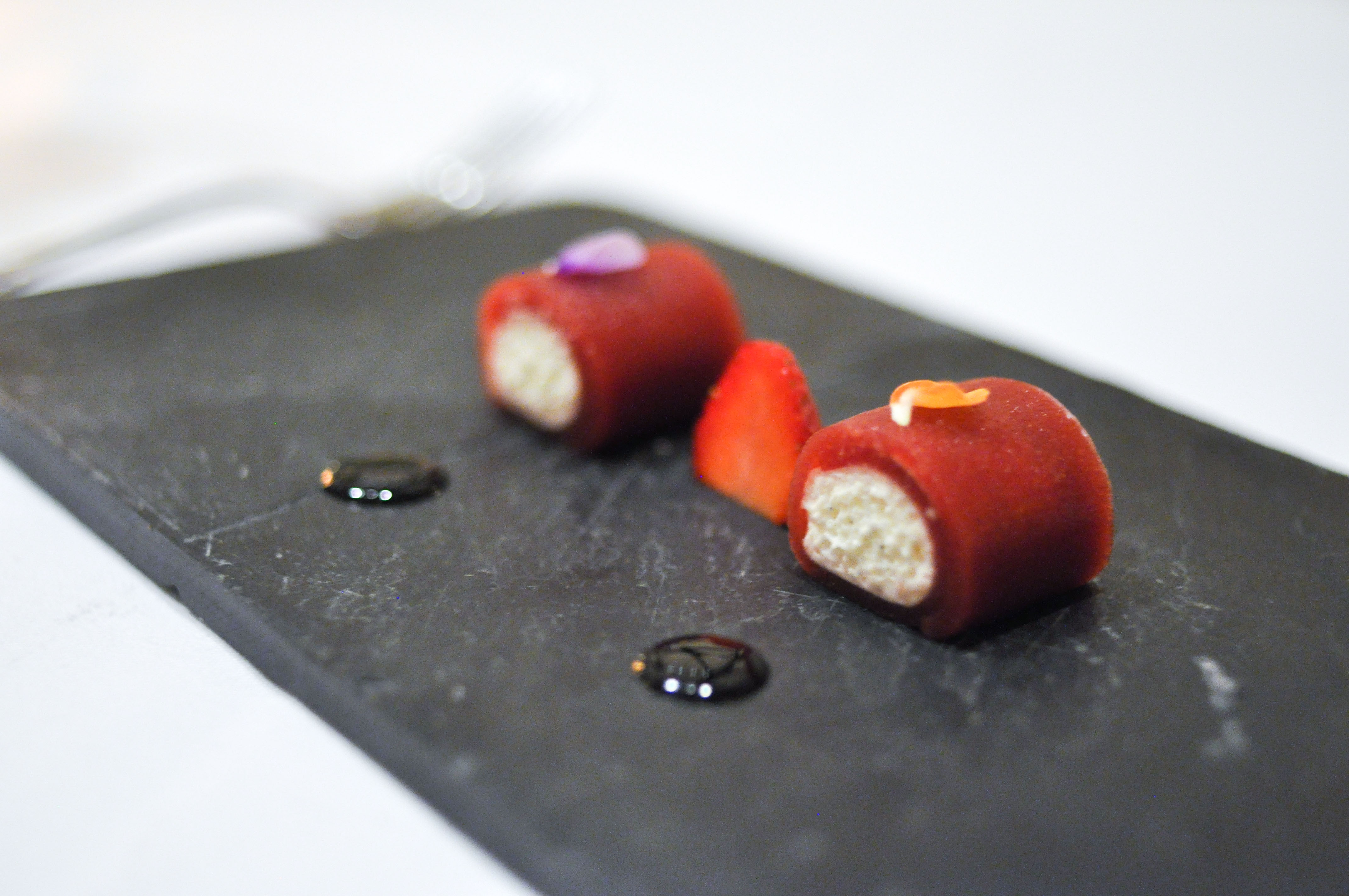 Strawberry ‘cannelloni’ with creme fraiche and balsamic reduction. A kick ass berries and cream plate.