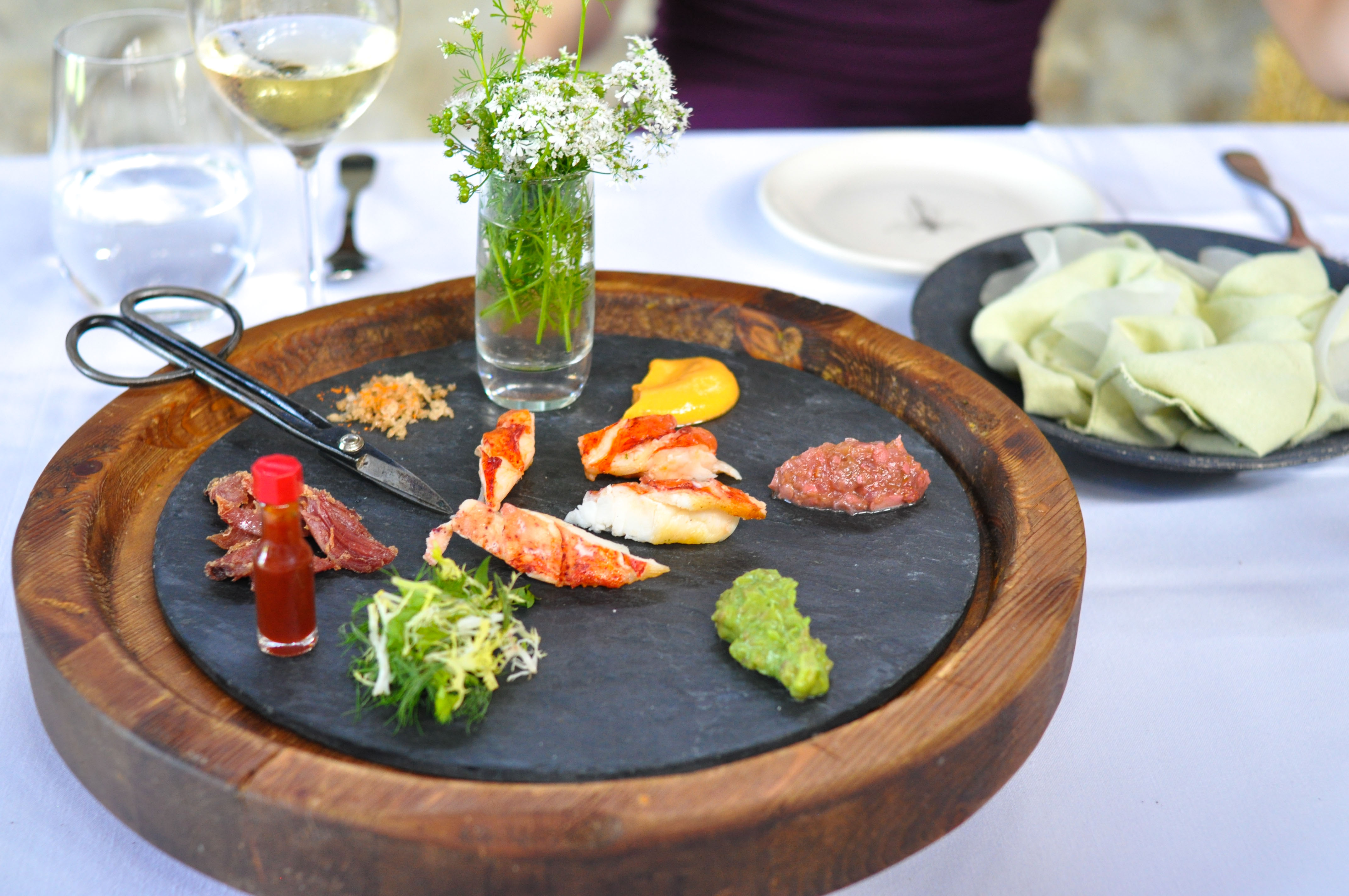 Next up: Tacos. Fourchu lobster, kohlrabi, ham hock, artichoke, strawberry compote, carrot puree, coriander, watermelon molasses hot sauce, and smoked salt with lobster roe.