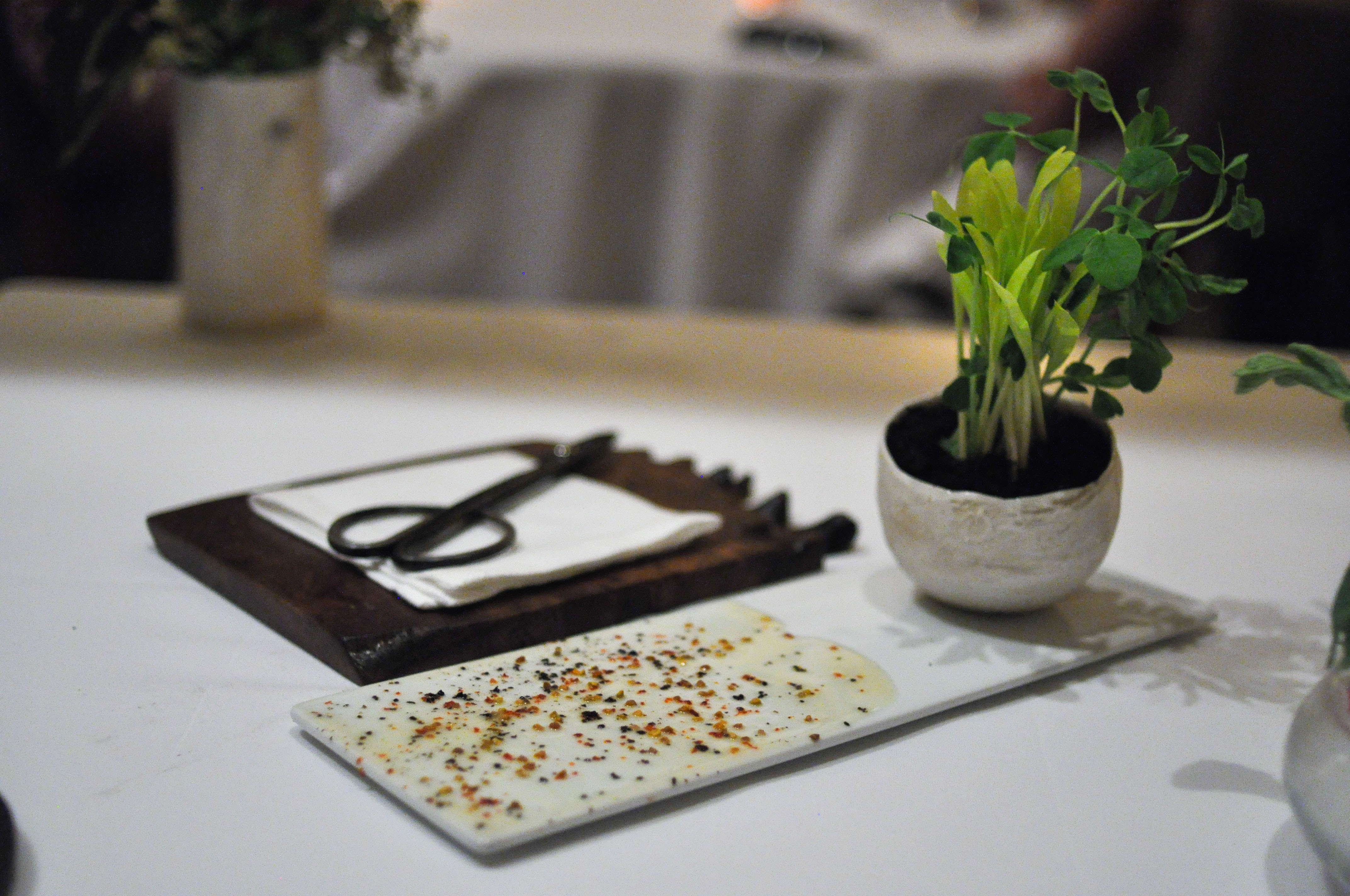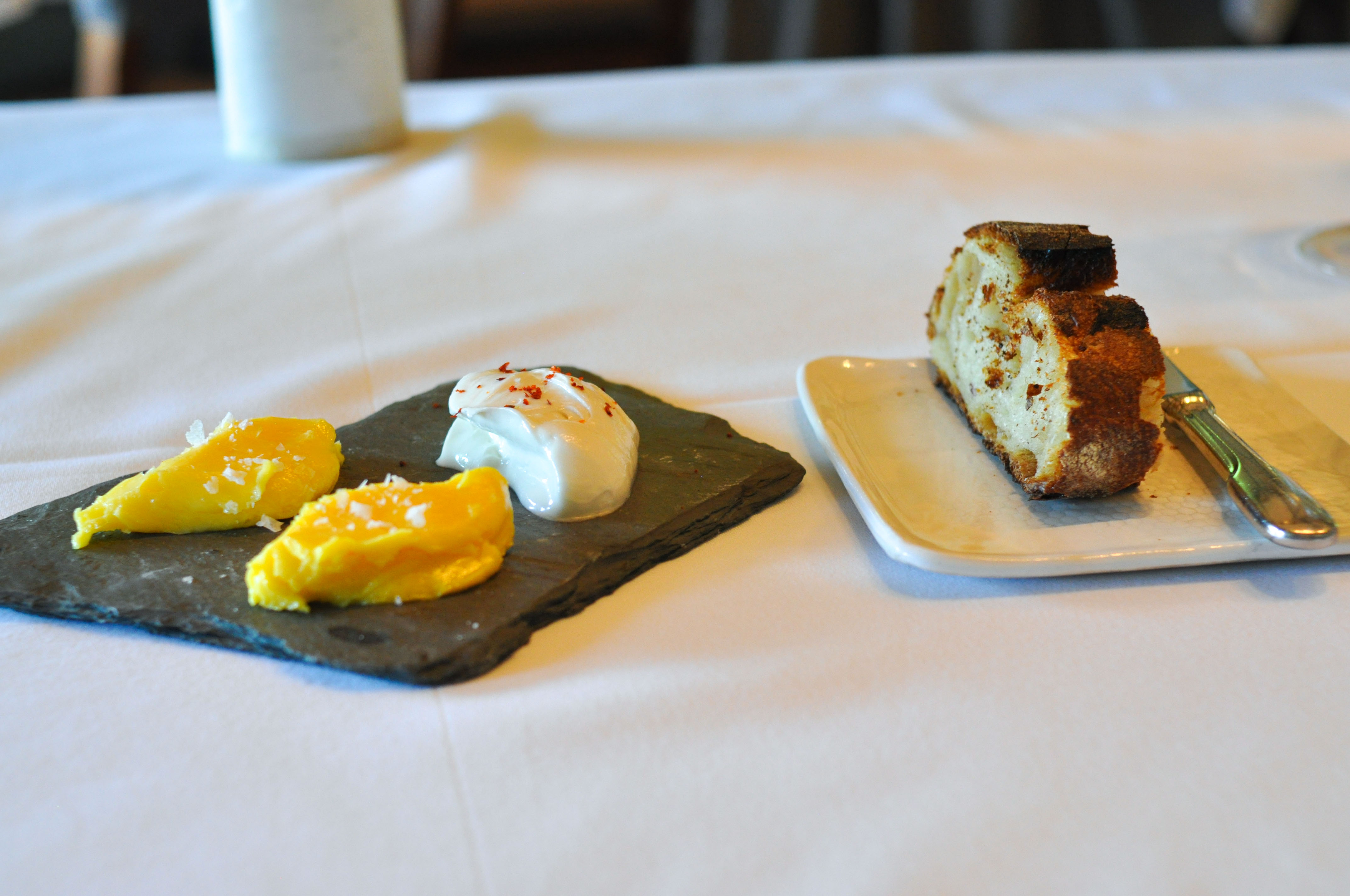 Potato onion bread with Hudson Valley butter, Tulip’s butter(Normandy cow), Blue Hill lardo, and corn salt.