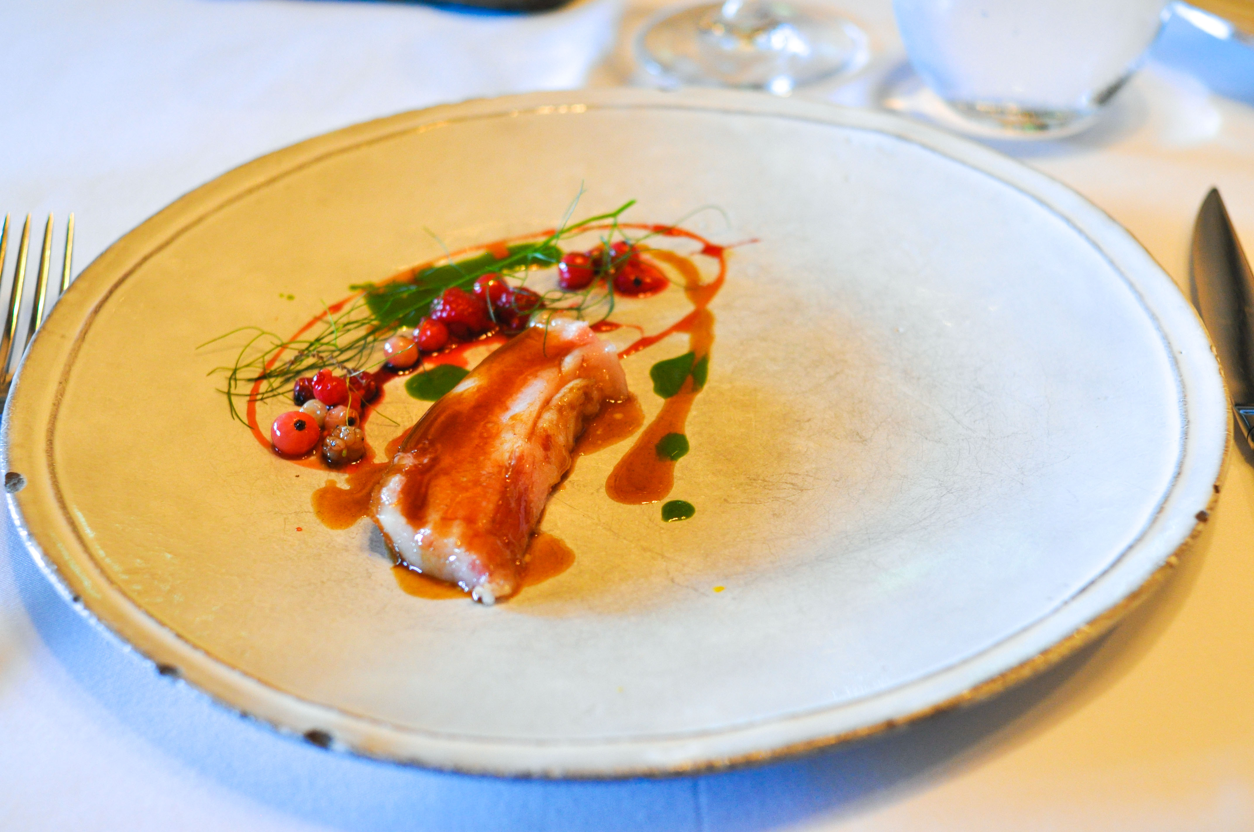 Blue Hill pork jowl with mulberry, wineberry, fennel, and herb sauce.