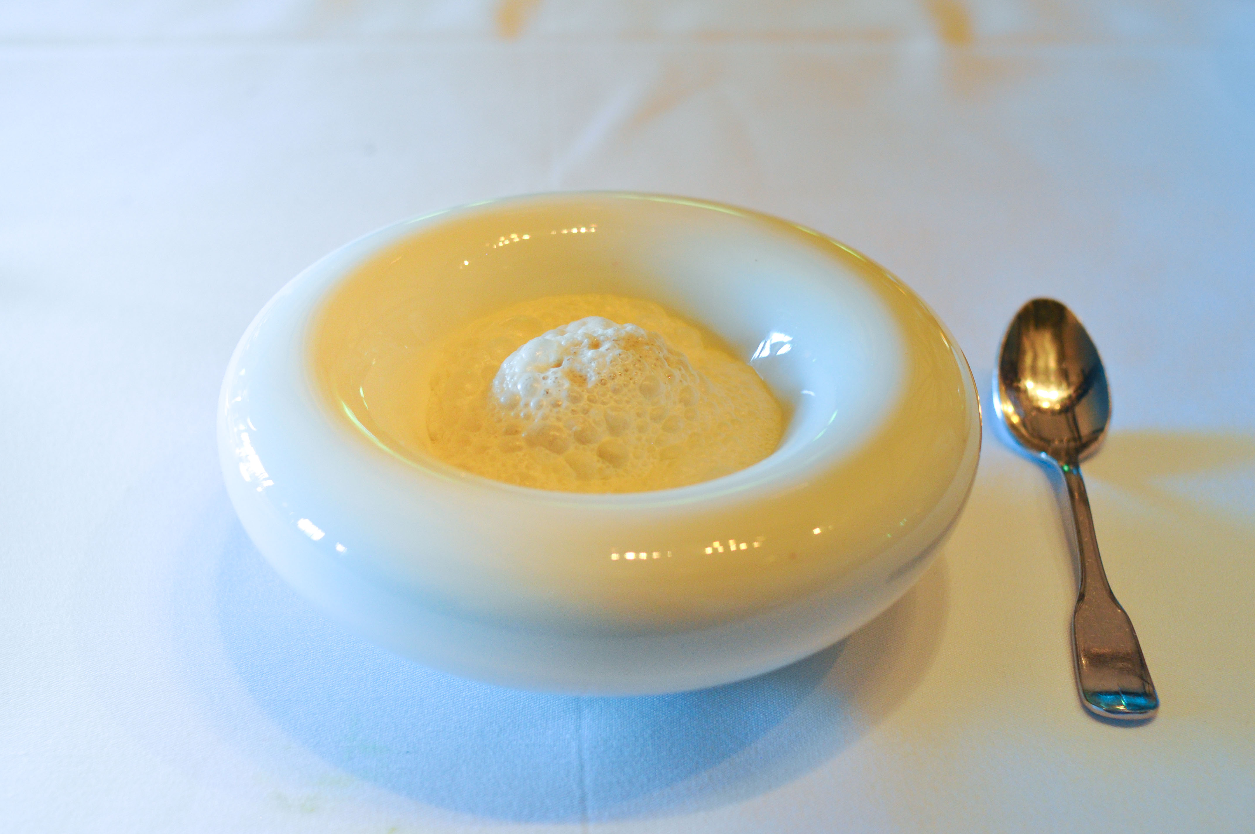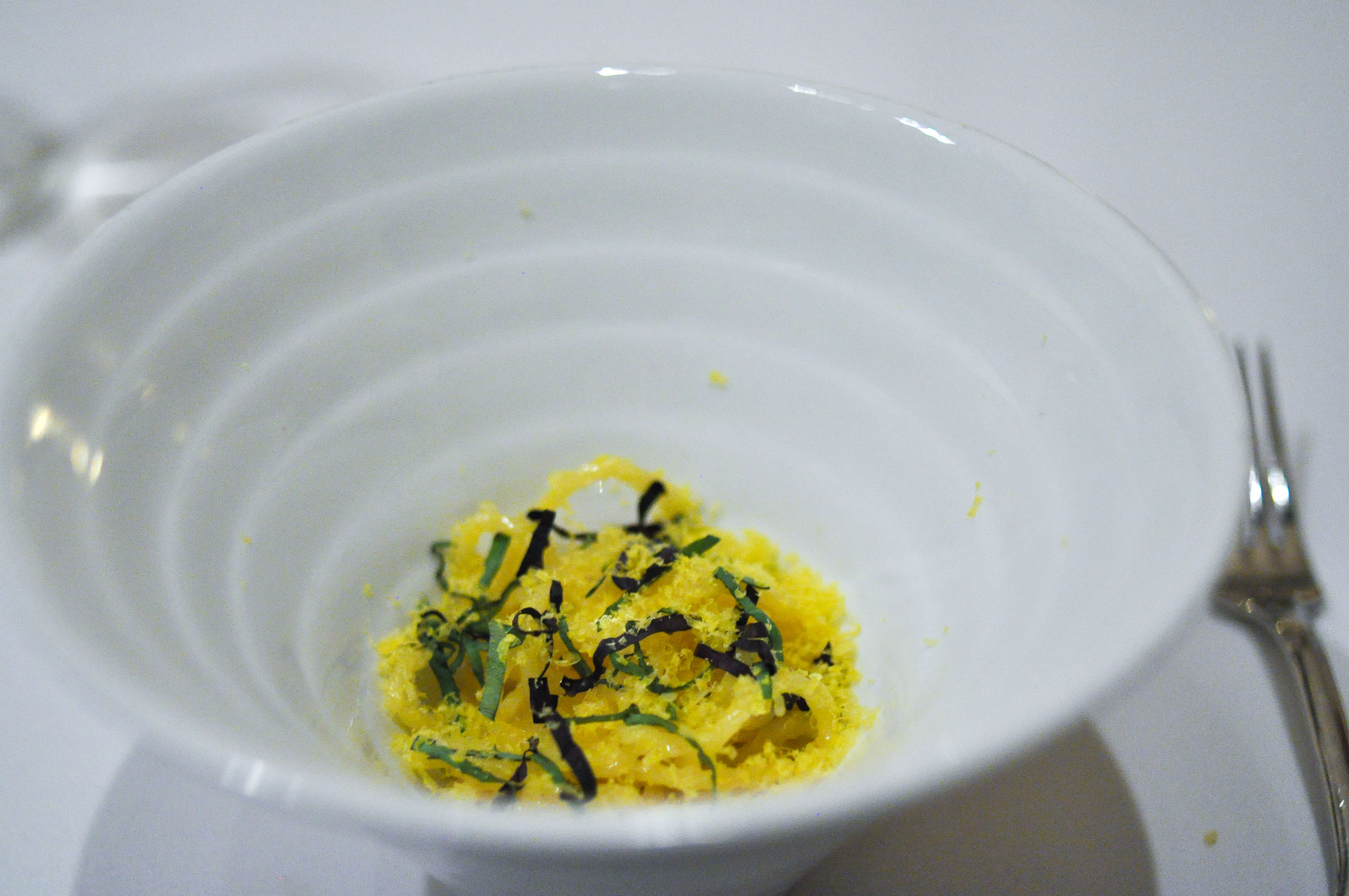 Celtuce, diced and in a broth. With pinenut, Blue Hill yogurt, shungiku, and green apple. Cool, vegetal, fresh.