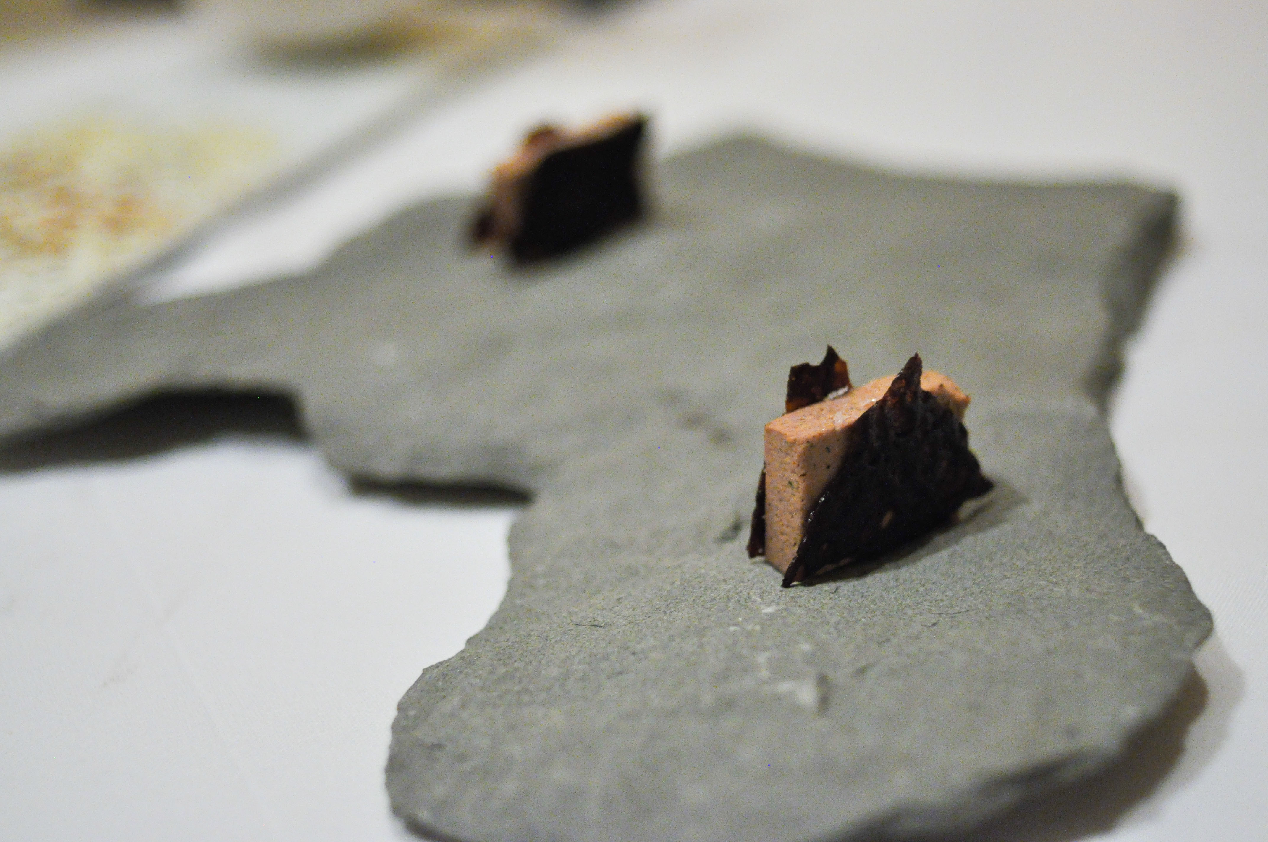 We were presented with examples of Blue Hill’s biochar process. Then a few items prepared with the biochar. First a pretty effing delicious, dense, dark mix of squid, celery root, and charcoal. Then a badass wedge of cabbage cooked over biochar and topped with speck alongside an uninspired quince puree.