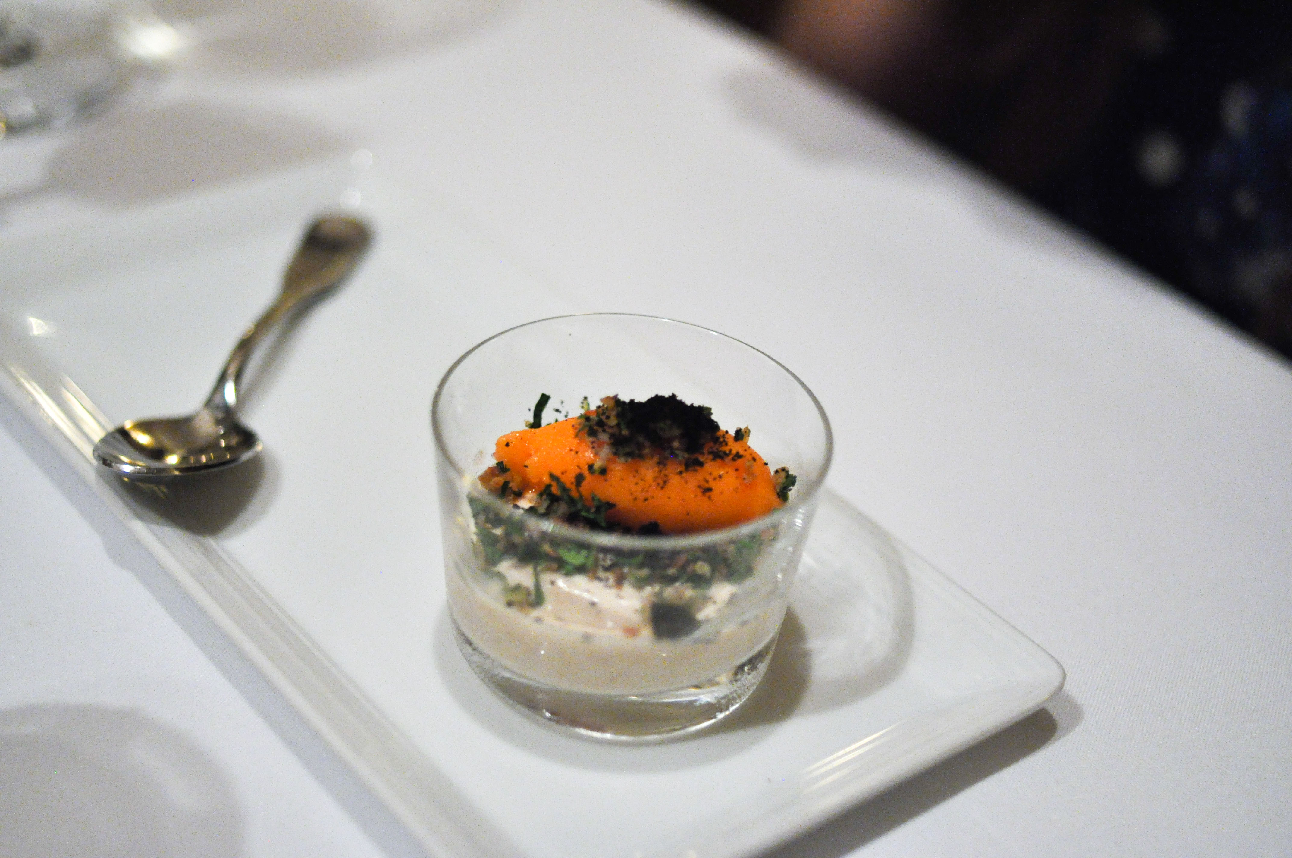 Honey expressions. Three textures of honey from three seasons. Spring honey with carrot and tarragon. Summer honey with Carolina Gold Rice. Fall honey with pistachio. Quite a tasting. The summer and fall were dynamite. Presented handsomely in stacking dishes resembling honeycomb cells.