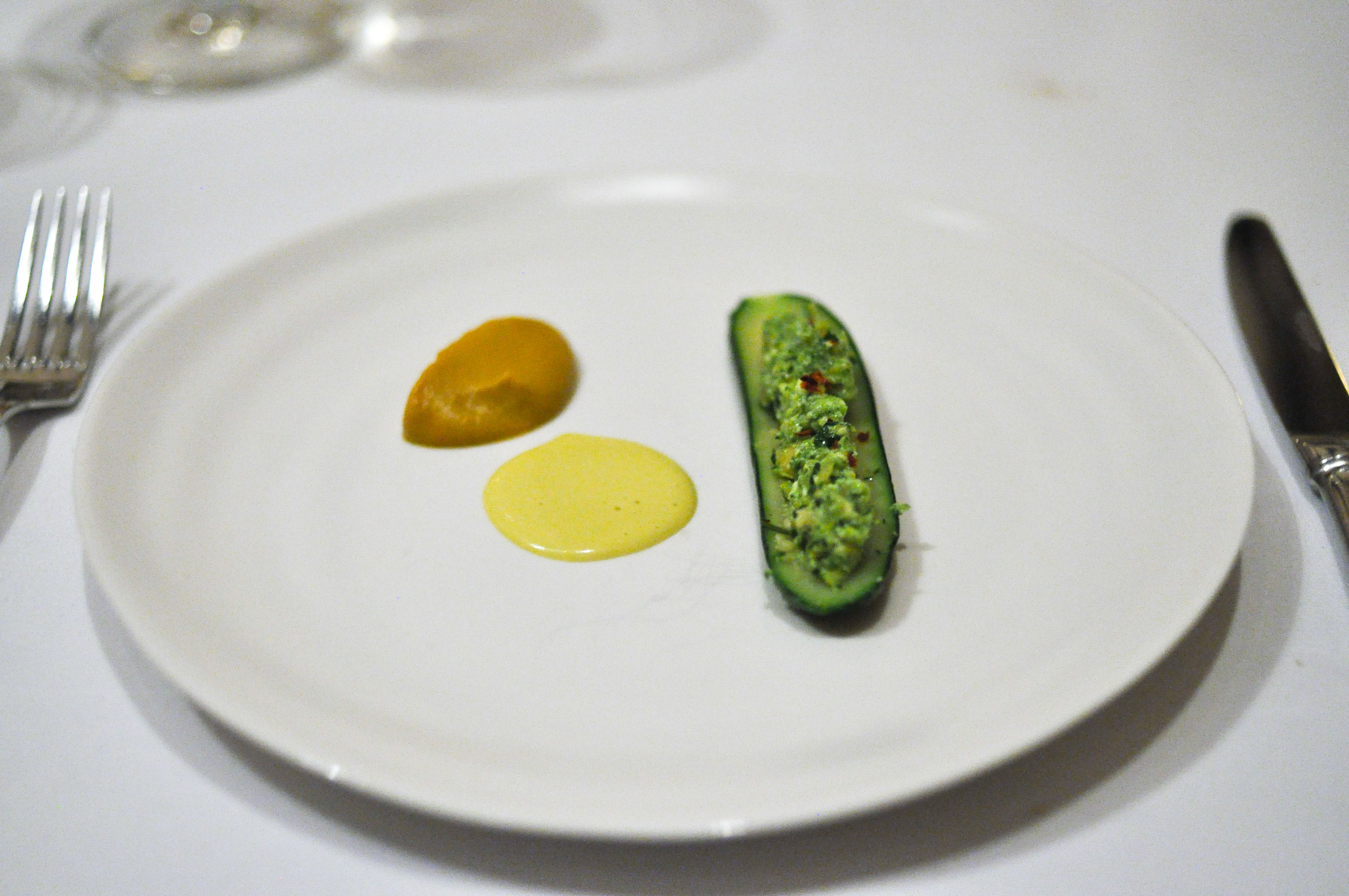 Blue Hill egg yolk, zucchini, ham. A small, quick, and rich little plate.