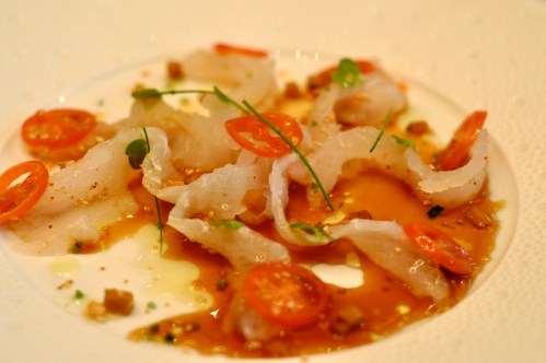 For my first course, I chose the fluke sashimi with crispy kimchi in a chilled citrus, soy, jalapeno nage. This dish was greater than the sum of its parts, and the only instance in which I remember liking anything with kimchi flavor.