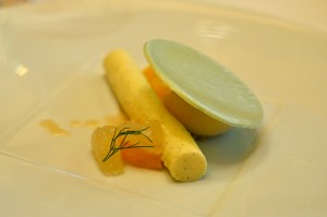 We sat and browsed the menu. The Bro shares my preference for vegetables over proteins, so we opted for the vegetable tasting. I indulged my usual habit of supplementing extra courses. To drink, we got a modest bottle of The Bro’s favorite grape: 2009 Riesling Kabinett from Wehlener Sonnenuhr in Mosel by S. A. Prum. A little bit of floral and citrus, with racy stone fruit and mineral body, and slight spice on the finish. A fresh, high-acid compliment to our dinner.