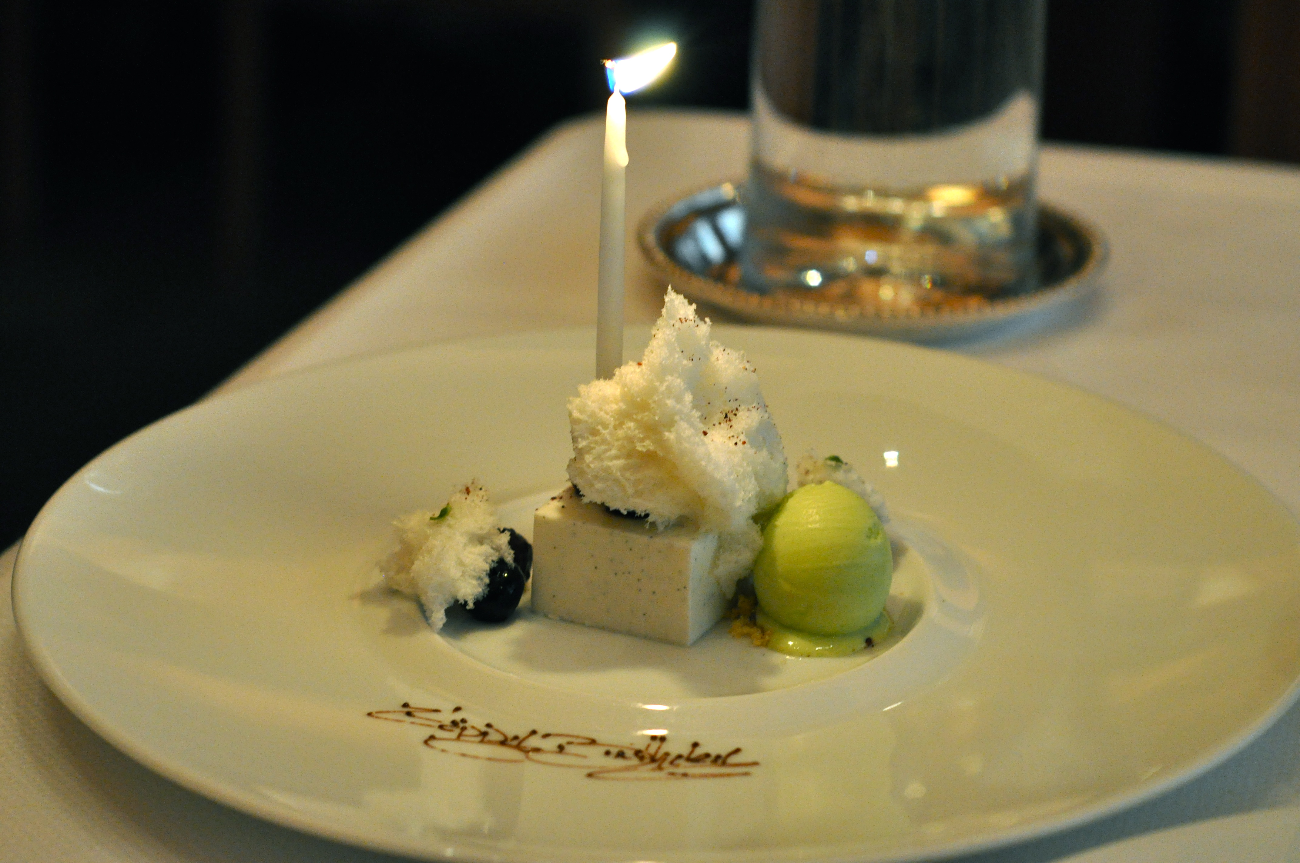 When it came to dessert selection, I was stuck between two choices. The first: grapefruit sorbet, vanilla cream, tarragon coulis and crisp meringue. That was my captain’s choice for the best on the list. The other: vanilla yogurt parfait, blueberry, basil ice cream and yogurt sponge. That was his choice for the most comparable item to a dessert I had there the previous spring. I opted for the former. Shortly after it arrived, along came the latter as well, complete with candle and Happy Birthday scribbled in chocolate.